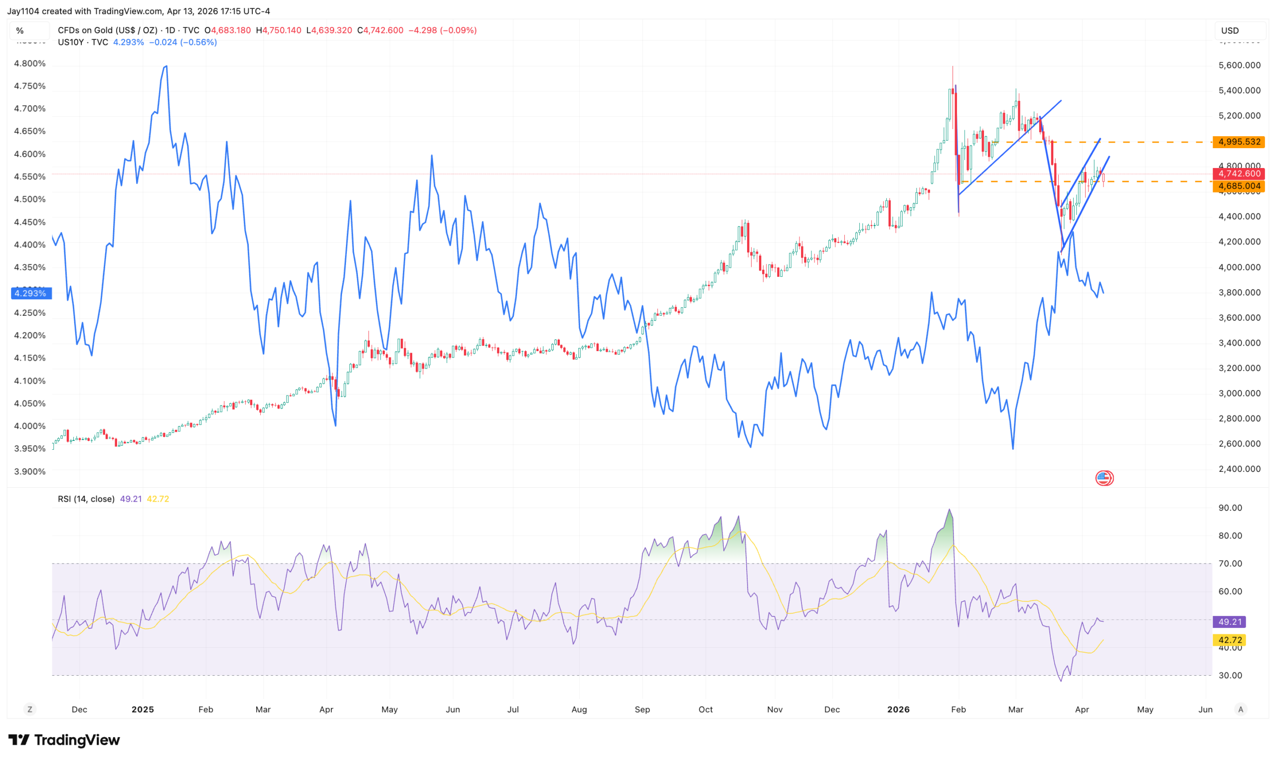 So, if gold is forming a bear flag while rates are forming a bull flag, it suggests that we are currently in a period of consolidation in both rates and financial conditions as the market digests recent developments. If the bear flag in gold plays out, it would likely imply a move back below $4,000.