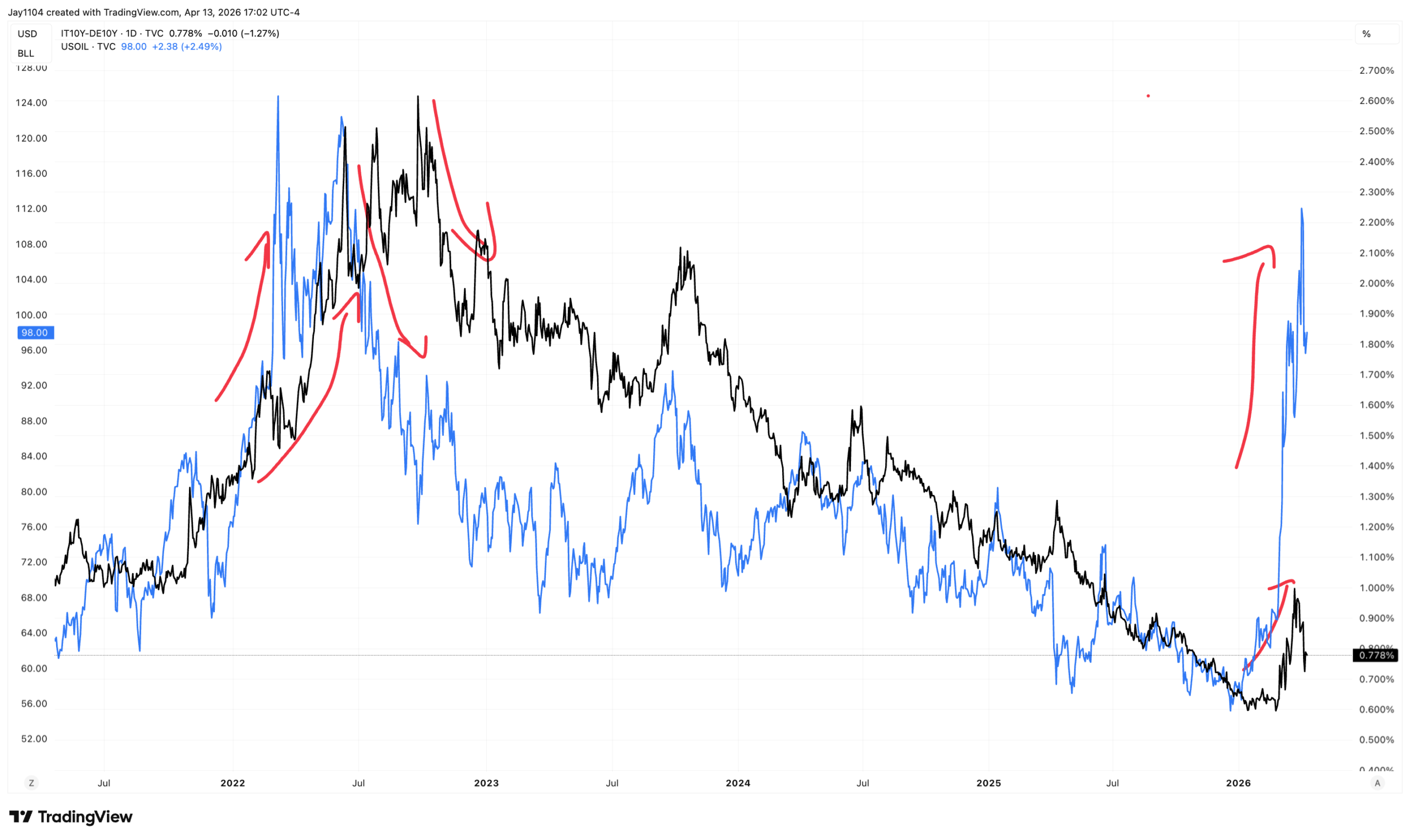 You can see something similar in gold, which appears to be forming a bear flag. The move in gold since late February also seems tied to rising rates — an observation that ultimately links back to oil.