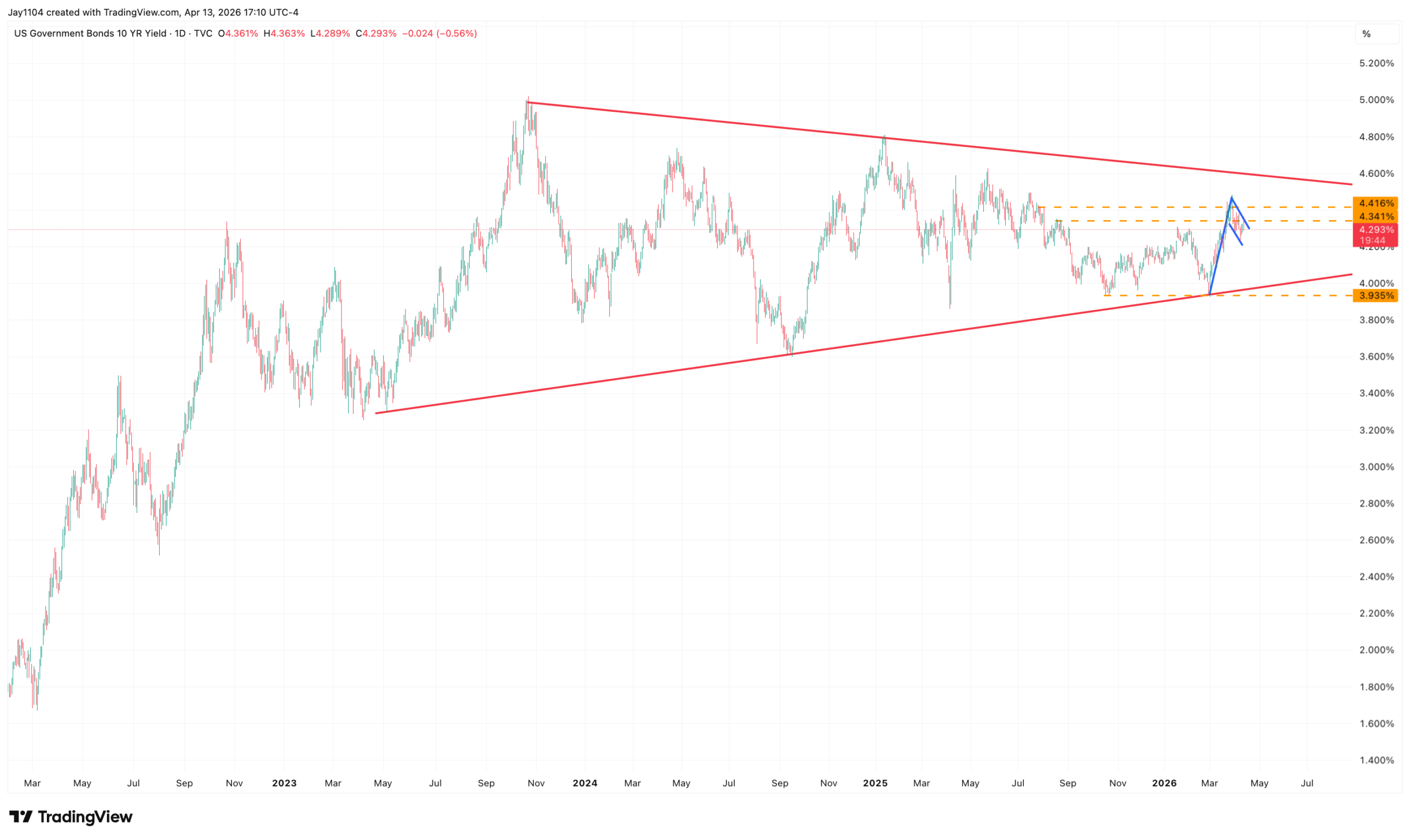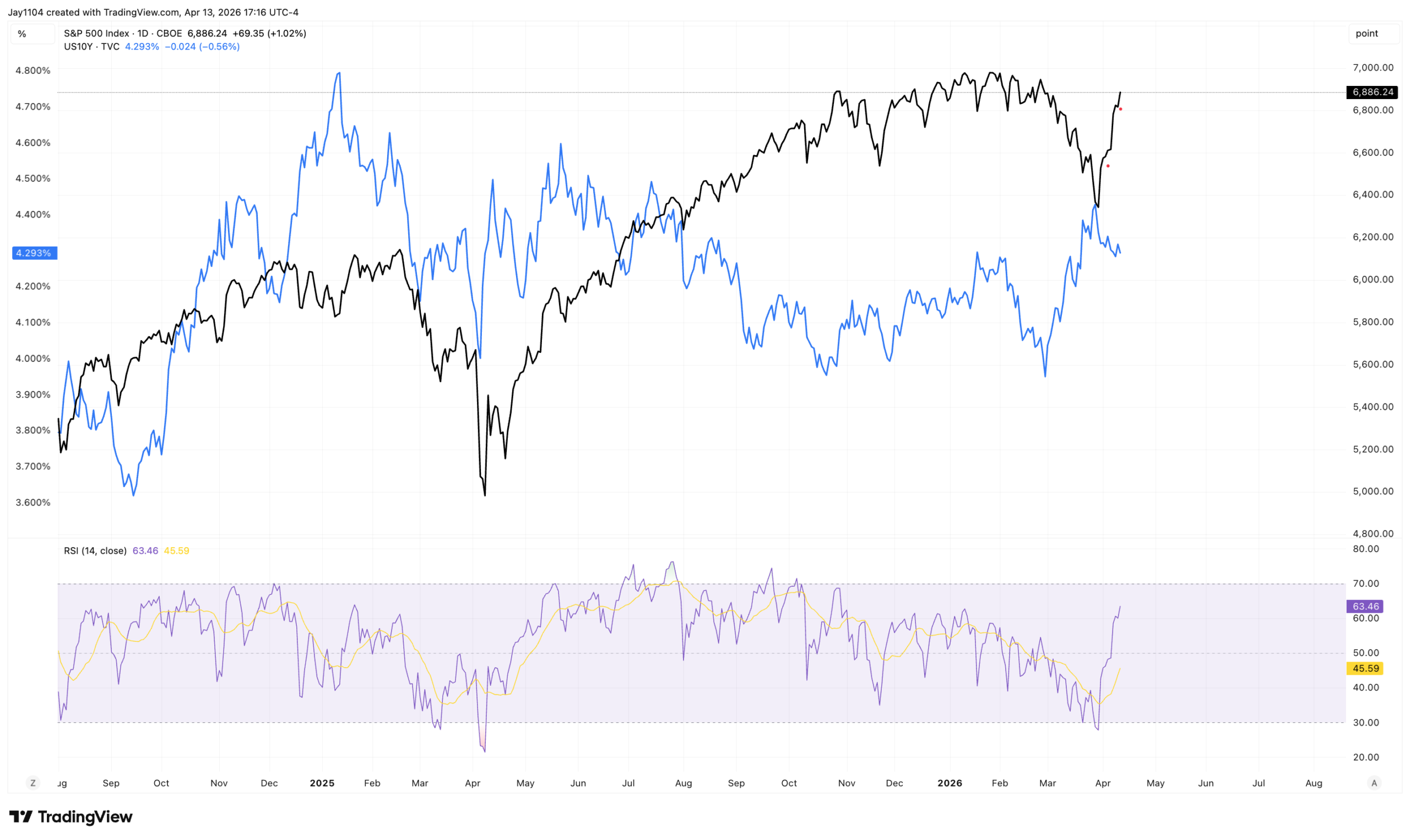 Additionally, rates have stalled following a very large move, and as long as Treasury yields are not rising, financial conditions are not tightening. That could change, though. When looking at the 10-year Treasury, it is possible to outline a developing bull flag pattern. If that proves correct, the backdrop for equities would likely shift meaningfully. However, for now, rates remain highly dependent on the path of oil and inflation.