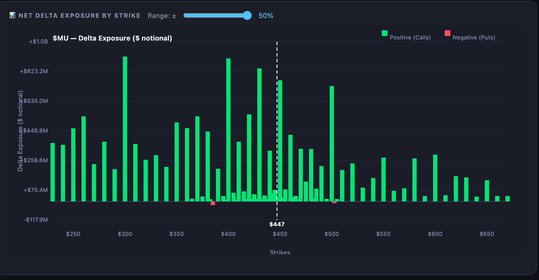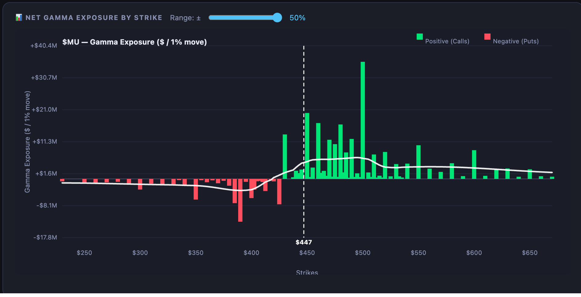 As long as the stock stays above $430, gamma will—at least based on today’s values—remain positive, so that region may offer support. However, if the stock breaks below $430, dealers will also become sellers, and the stock could very well be on its way to $400…ahh, maybe more like $390.