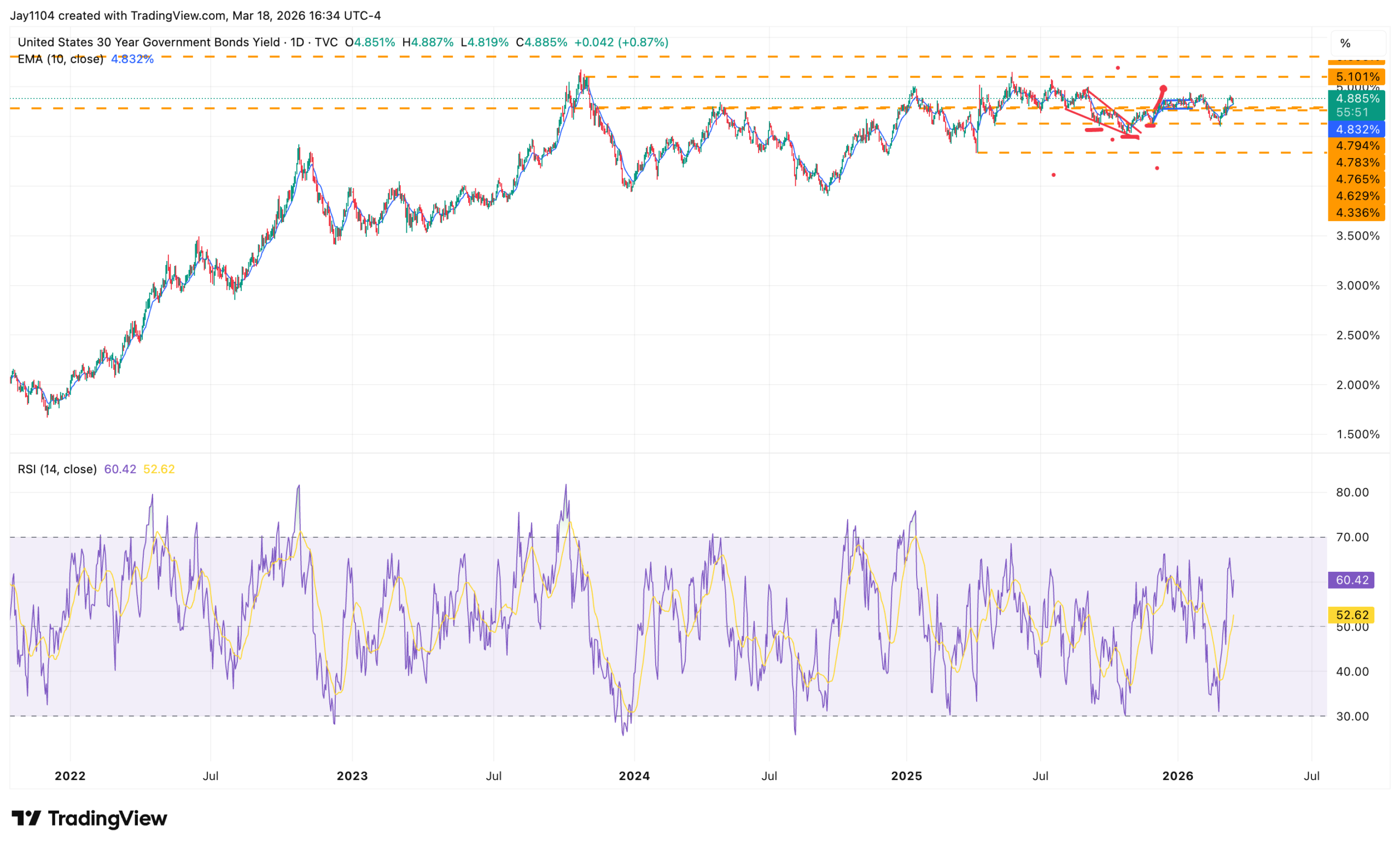 What’s really more interesting to me is the 30-year, because it is knocking on the door of 5% again, rising by 4 bps on the day to close at 4.89%. If oil stays at these levels or moves higher, and inflation is indeed heading higher, then a move above 5%—perhaps even back to 5.1% or 5.2%—can’t be ruled out.