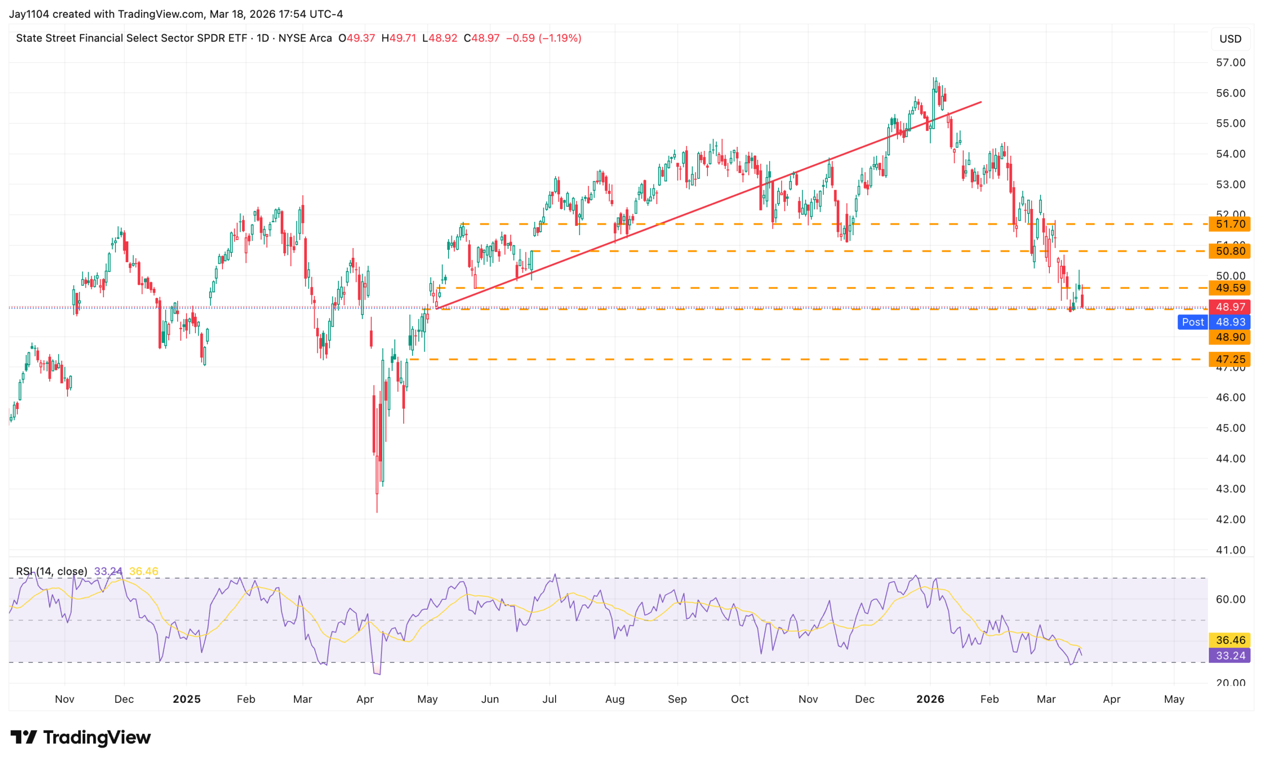 The XLF Financial ETF is very close to breaking a support level just below $49. After that, $47.25 is the next area of support on the chart, dating back to April of last year and also filling the gap from that time.