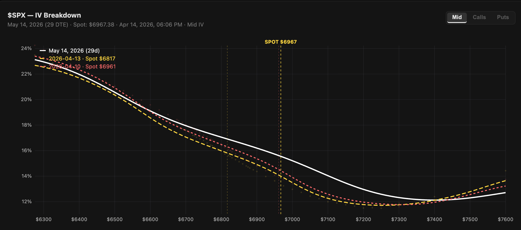 If that is the case, the VIX could be falling not because volatility is truly compressing, but simply because the S&P 500 is rising. Meanwhile, implied volatility at fixed strike levels could actually be increasing.