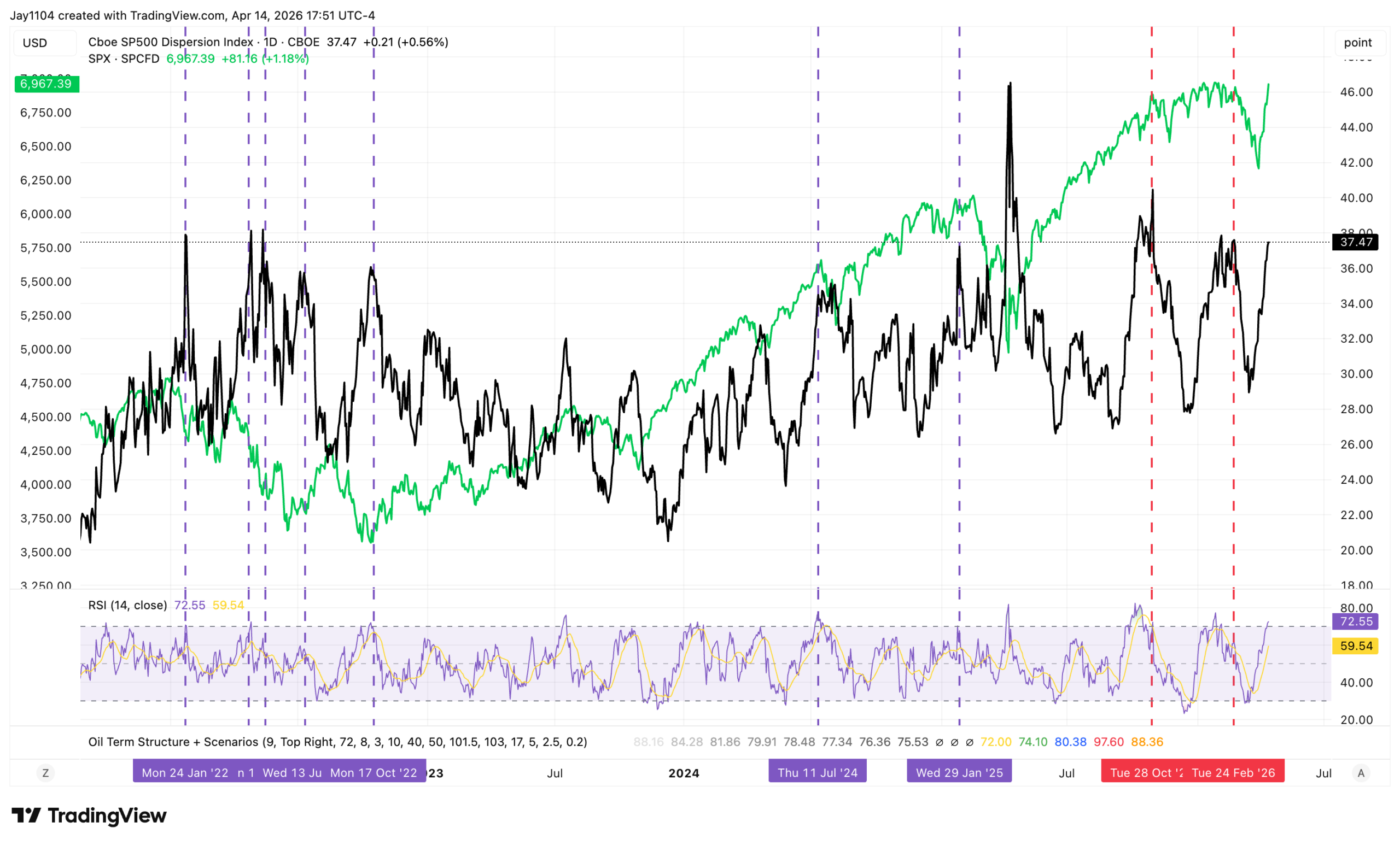 This is most clearly reflected in the recent moves in mega-cap stocks. The dispersion index is already back near its highs and at levels where it has historically topped out.