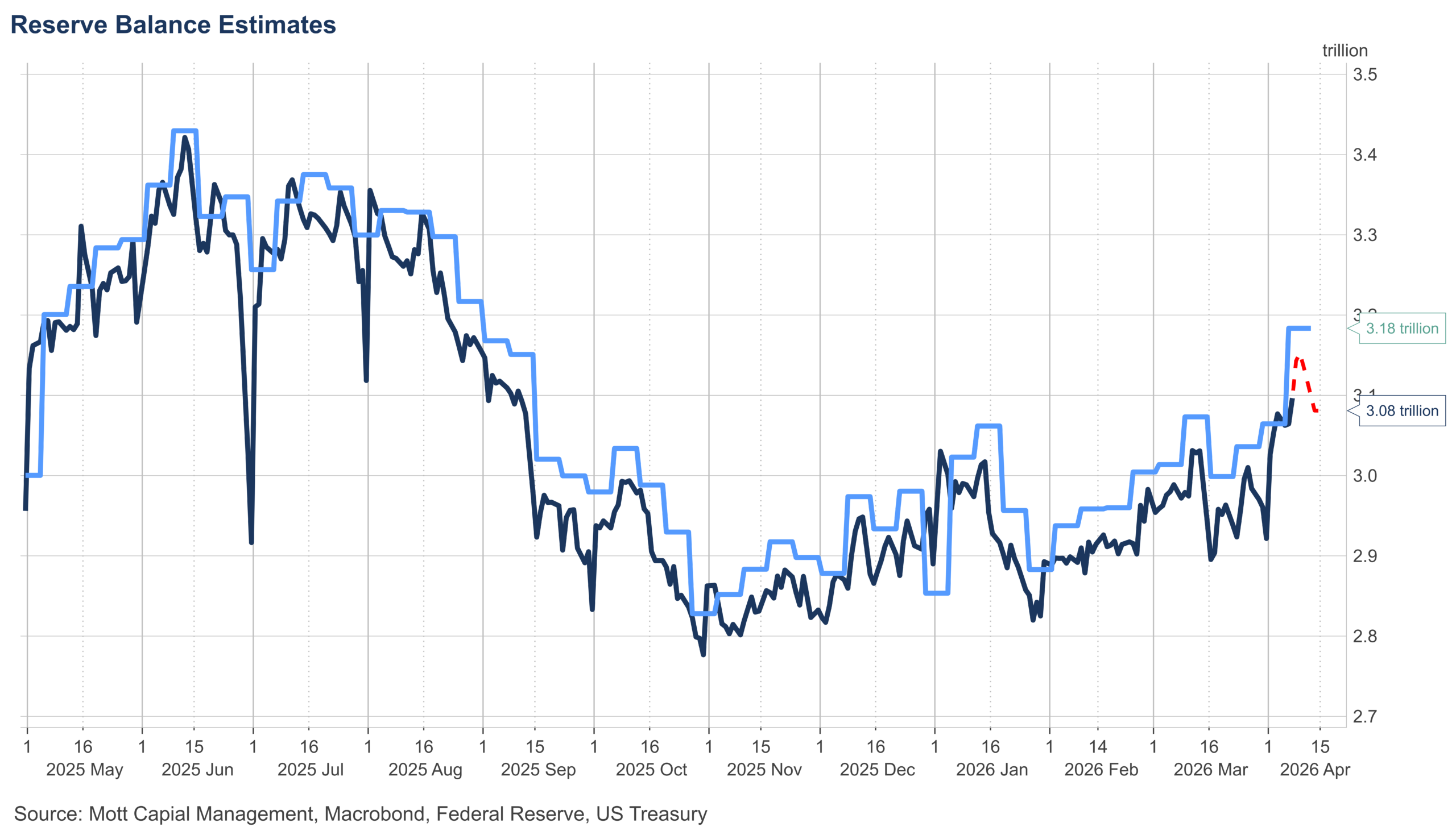 As a result, reserve balances held at the Fed are likely to decline meaningfully from here. They have already slipped back below $3.1 trillion and are probably headed toward the $2.9 trillion level.