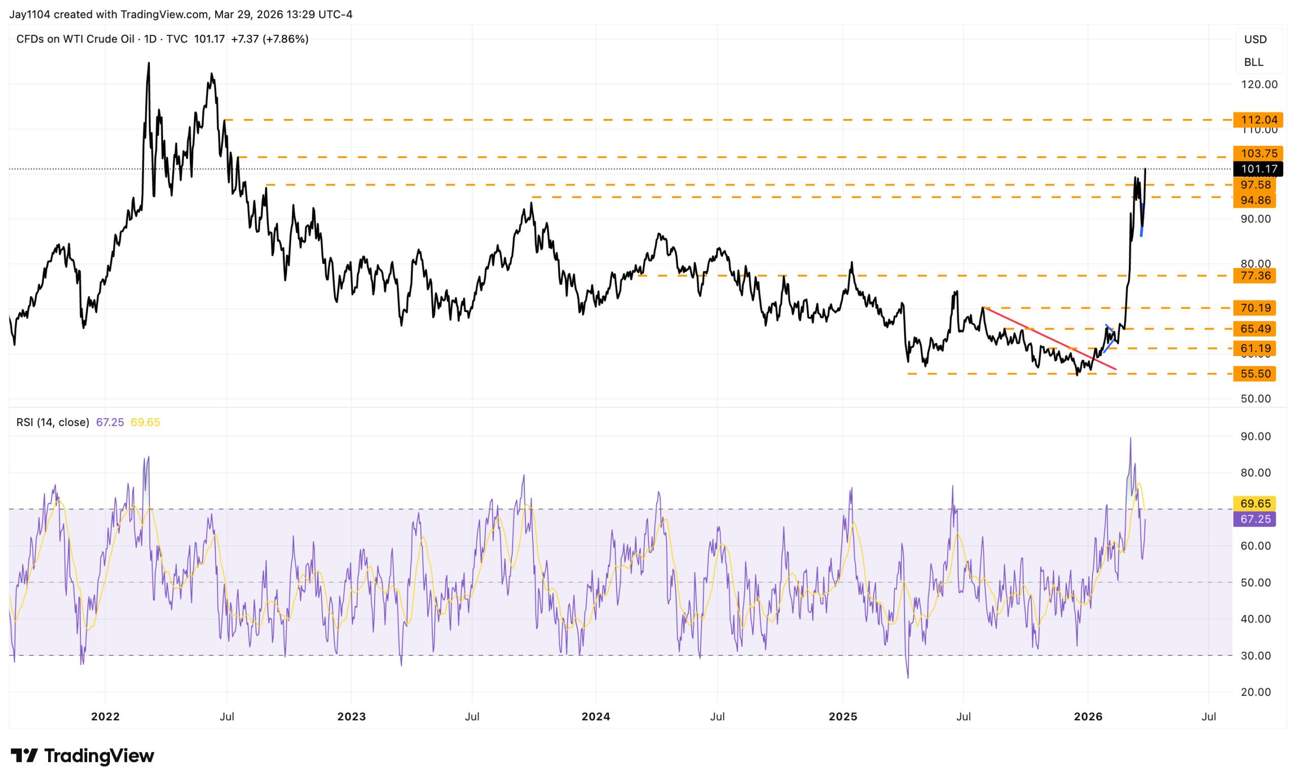 But again, just looking at the technical chart, it still seems like it could move higher. The trend in oil remains bullish, the 20-day moving average is still rising, and if oil can clear resistance in the $103 to $104 region on a closing basis, then there’s no reason it couldn’t rise to $112 or higher.