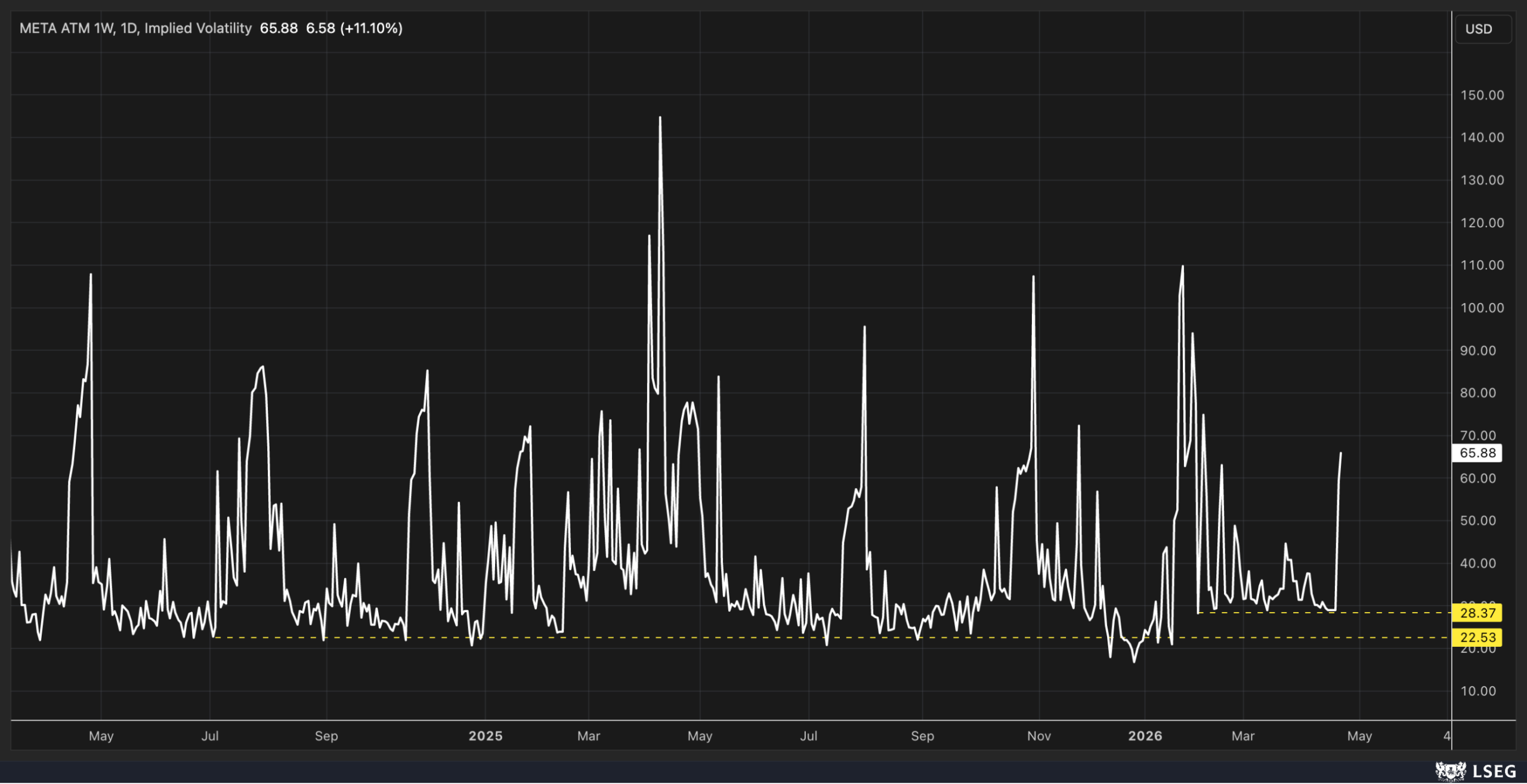 A good example is Meta. If its one-week at-the-money implied volatility falls back to its historical range, it could decline from roughly 65% to about 23%–28%. That would cause options premiums for May 1 expirations—especially out-of-the-money contracts—to fall sharply.