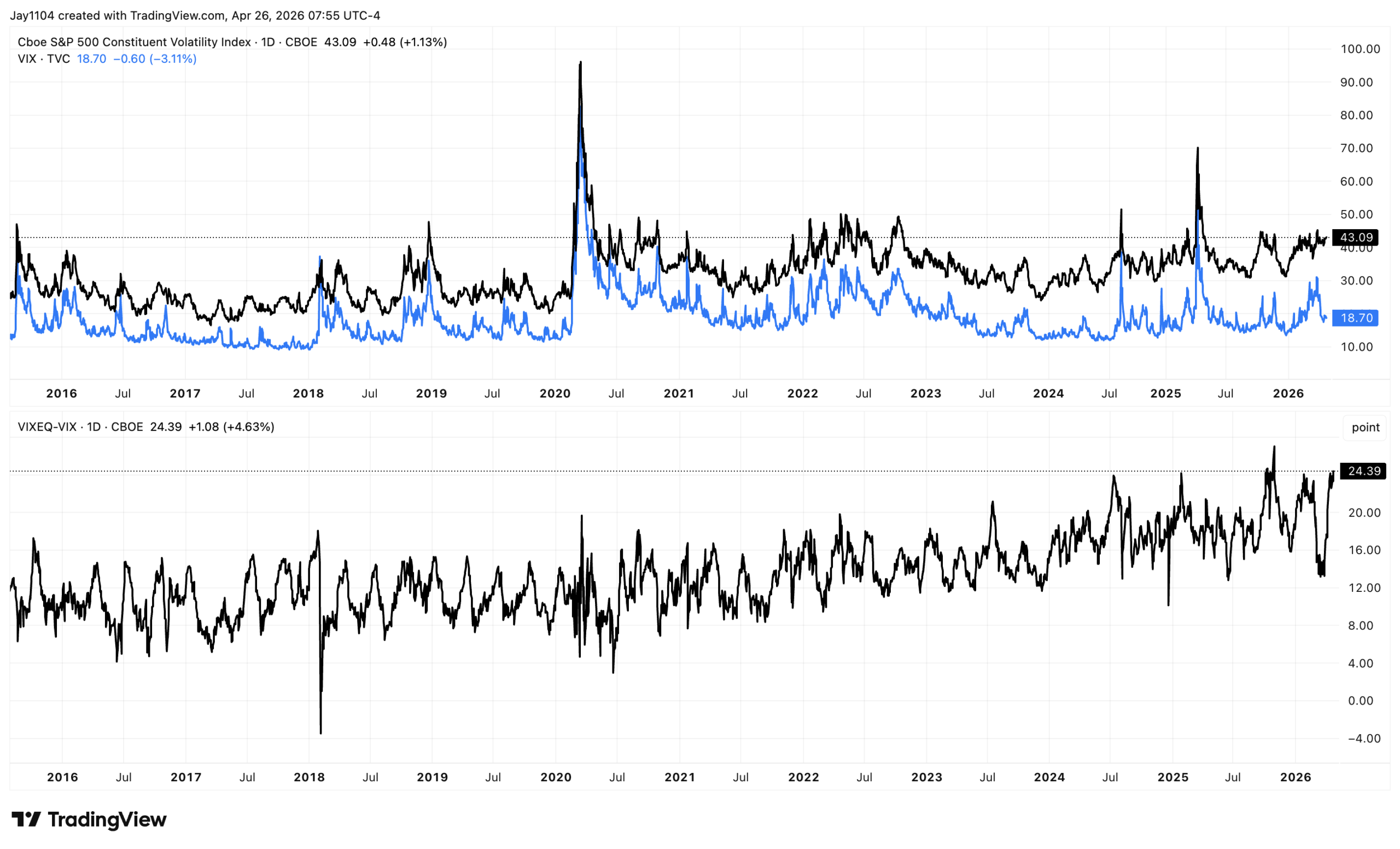 Implied volatility typically rises into earnings and then falls afterward, which is why the gap between S&P 500 constituent volatility and index-level volatility is so wide. That spread is now at a historically elevated level, which is why the dispersion index is at such a high level.