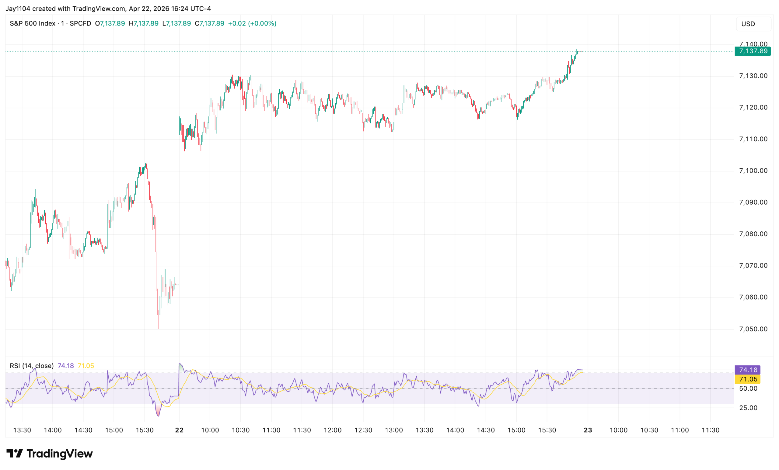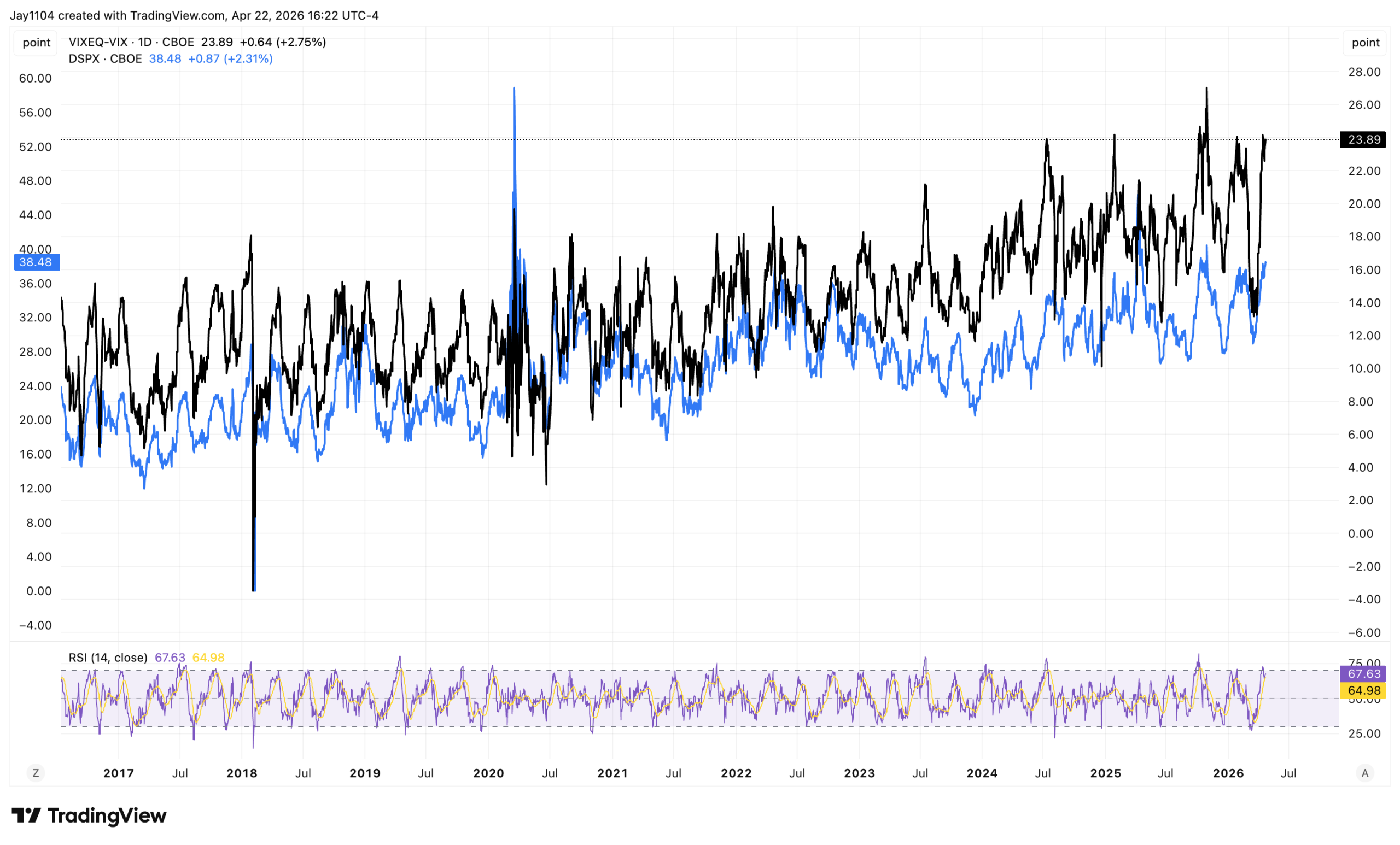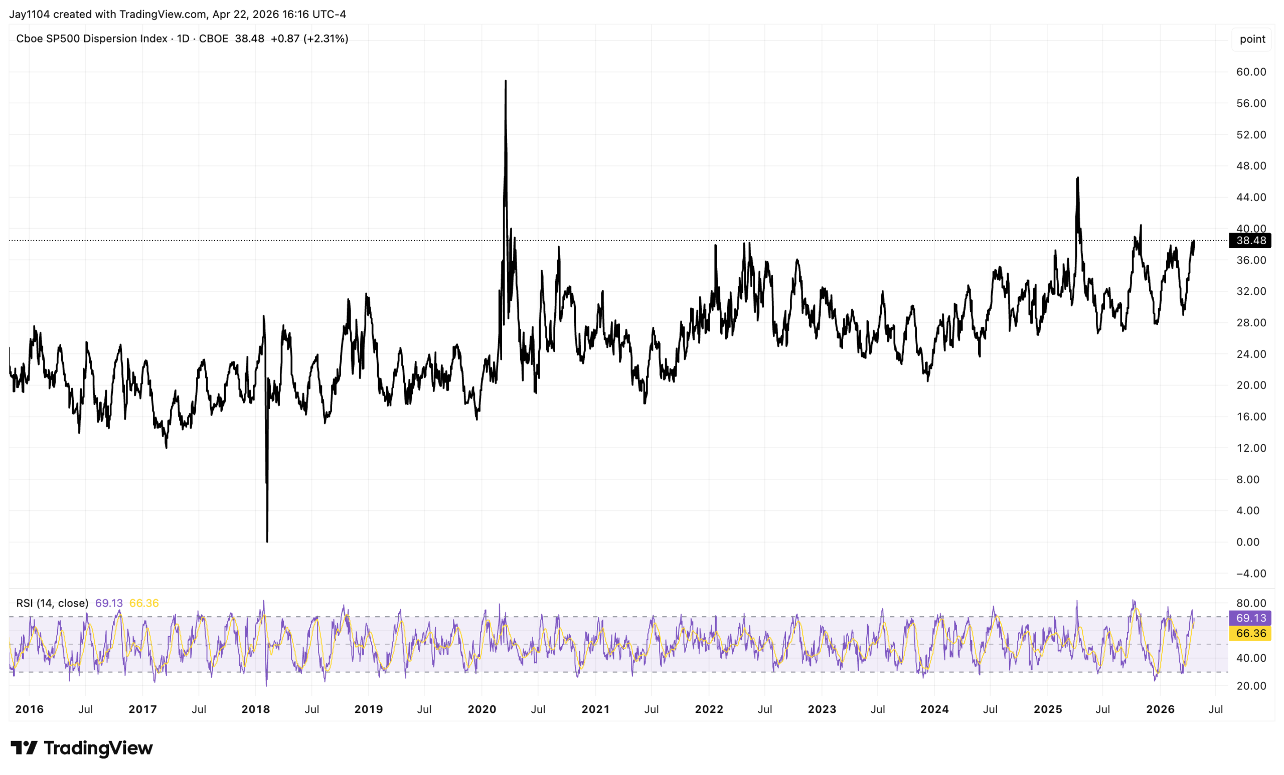 This was driven by S&P 500 constituent implied volatility remaining elevated, while the VIX index declined today. That caused the spread between the two to widen, making conditions more favorable for the dispersion trade. That spread, like the dispersion index, is extremely wide. It will begin to narrow as we move through earnings season, but until we get through the mega-cap results, it is likely to either remain at current levels or widen further.