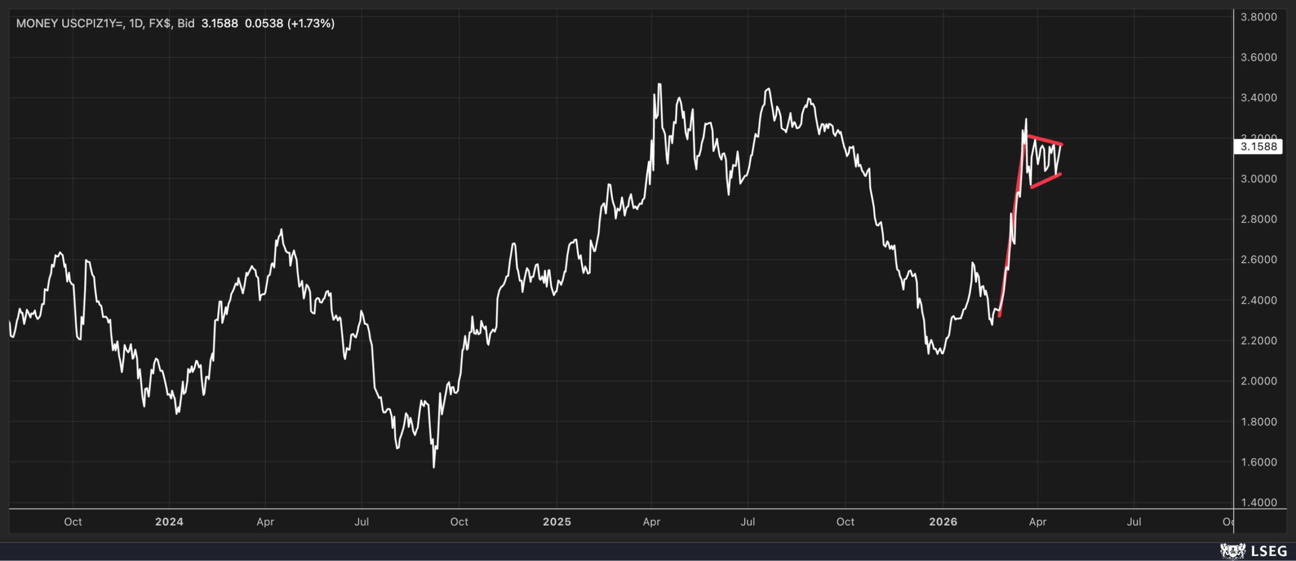 Additionally, 1-year inflation expectations appear to be coiling here, with a bullish-looking flag of their own, suggesting higher inflation may be on the way.
