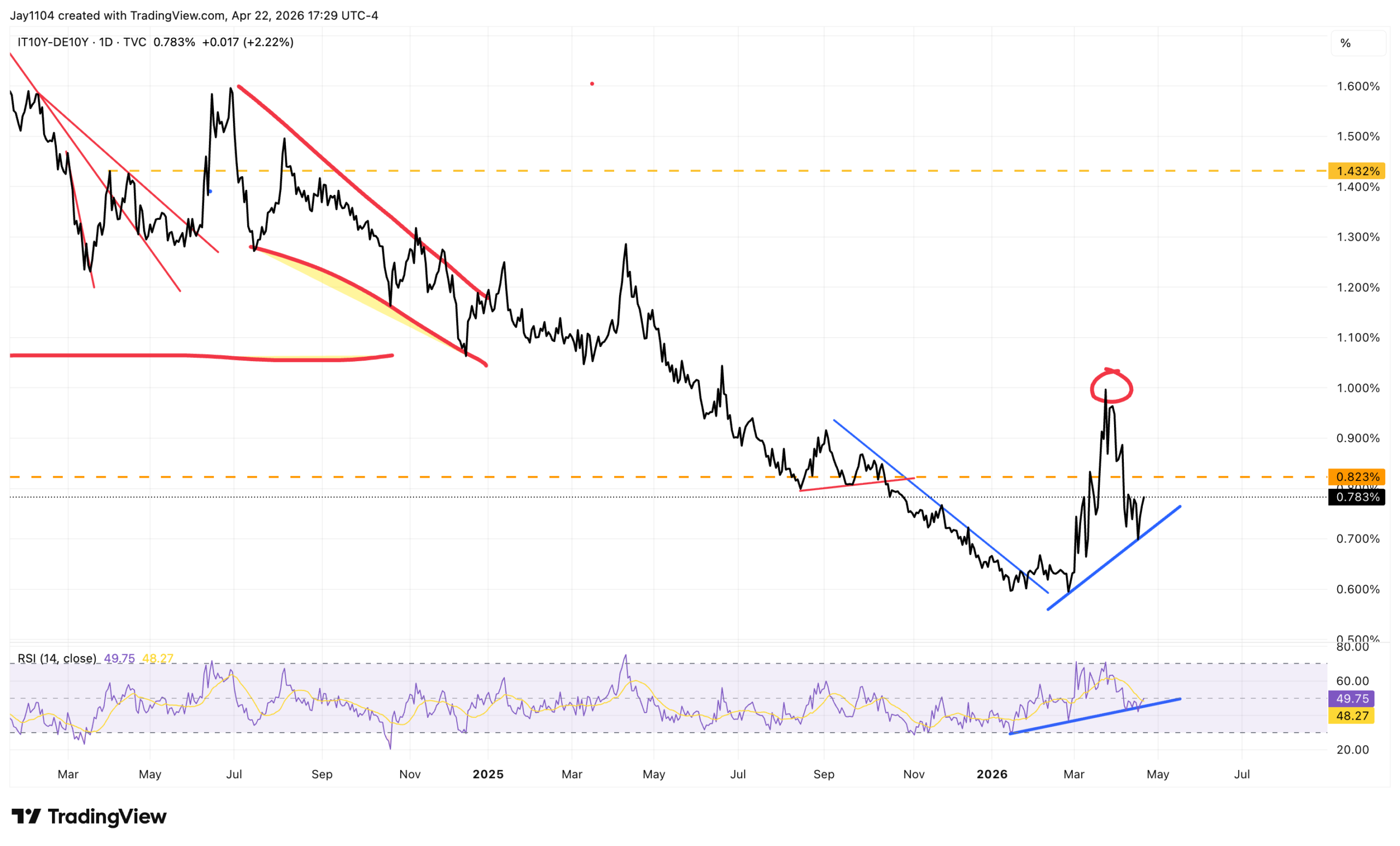 In the meantime, the spread between Italian and German 10-year rates widened by 2 bps. Again, this spread is very tight, but if it continues to widen, it is a signal that other spreads may begin to widen as well and, more importantly, that financial conditions are starting to tighten.