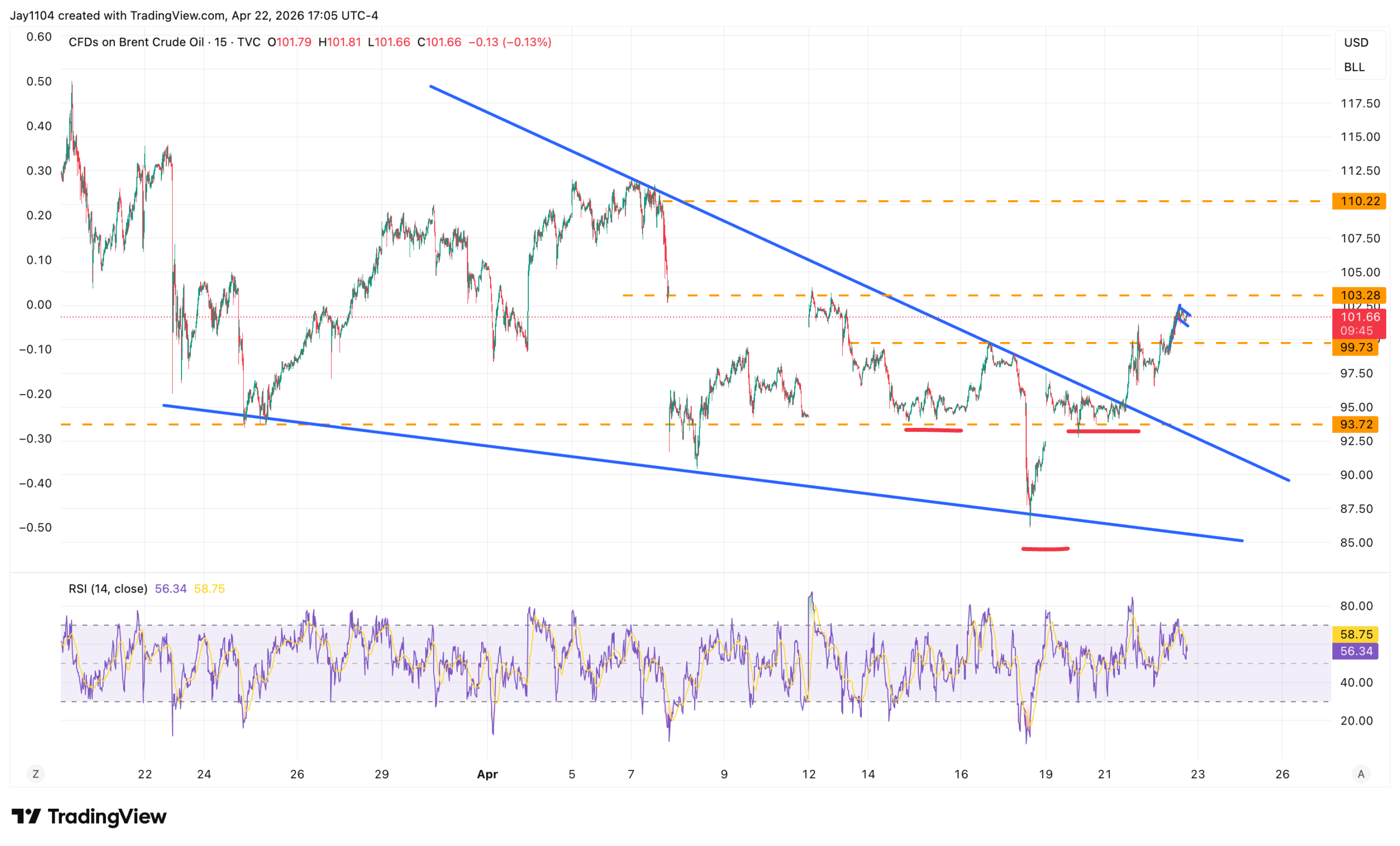 In the meantime, Brent oil prices rose by almost 3% on the day to nearly $102. At this point, the falling wedge has been broken, and oil now appears to have formed an inverse head and shoulders pattern on the intraday chart, along with a smaller bull flag. I think if we see Brent move above $104, it could very well be on its way to $110.
