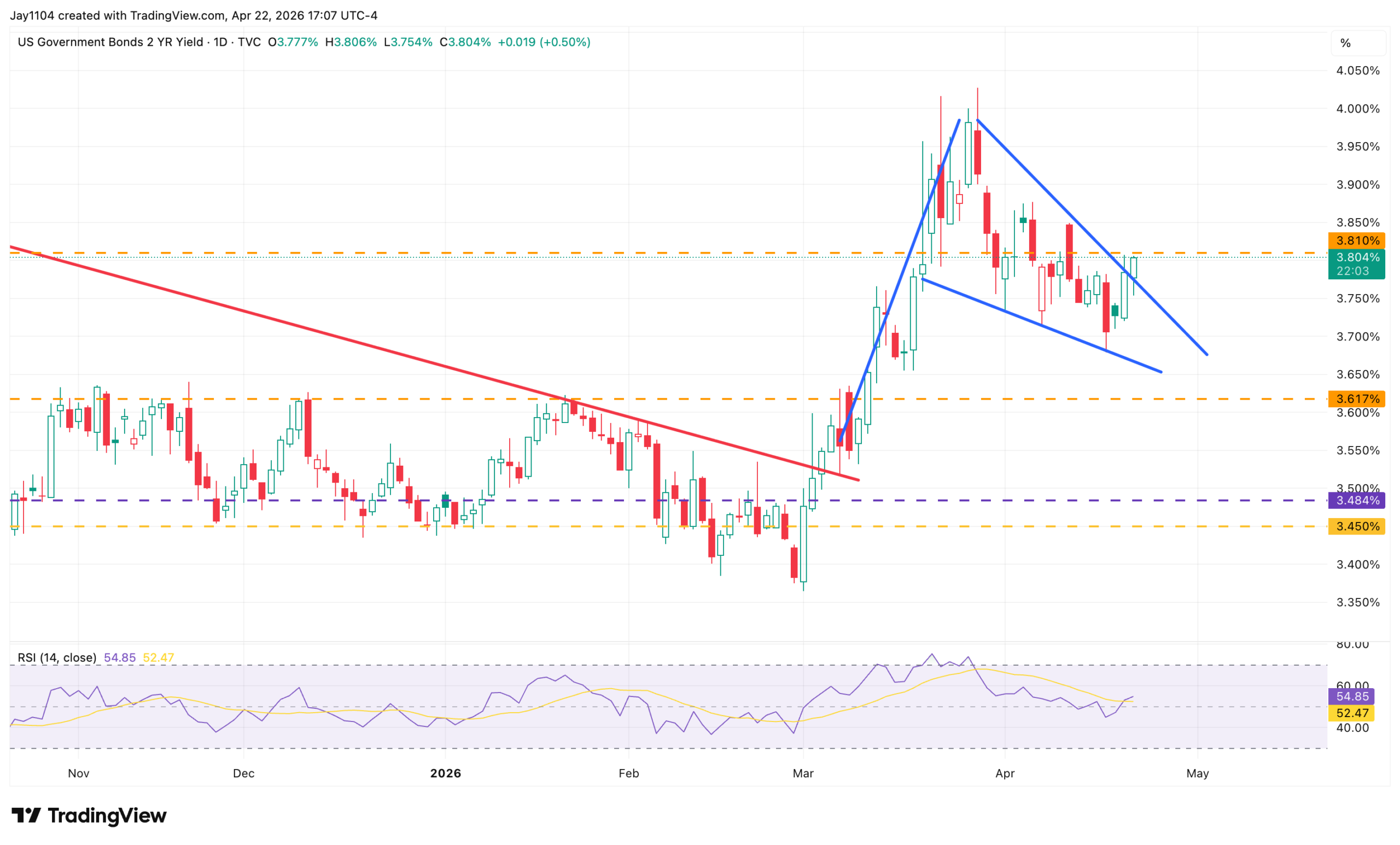 The 2-year also rose by 2 bps on the day, finishing at 3.8%. A move above resistance would likely set the 2-year up to climb back toward 4%.
