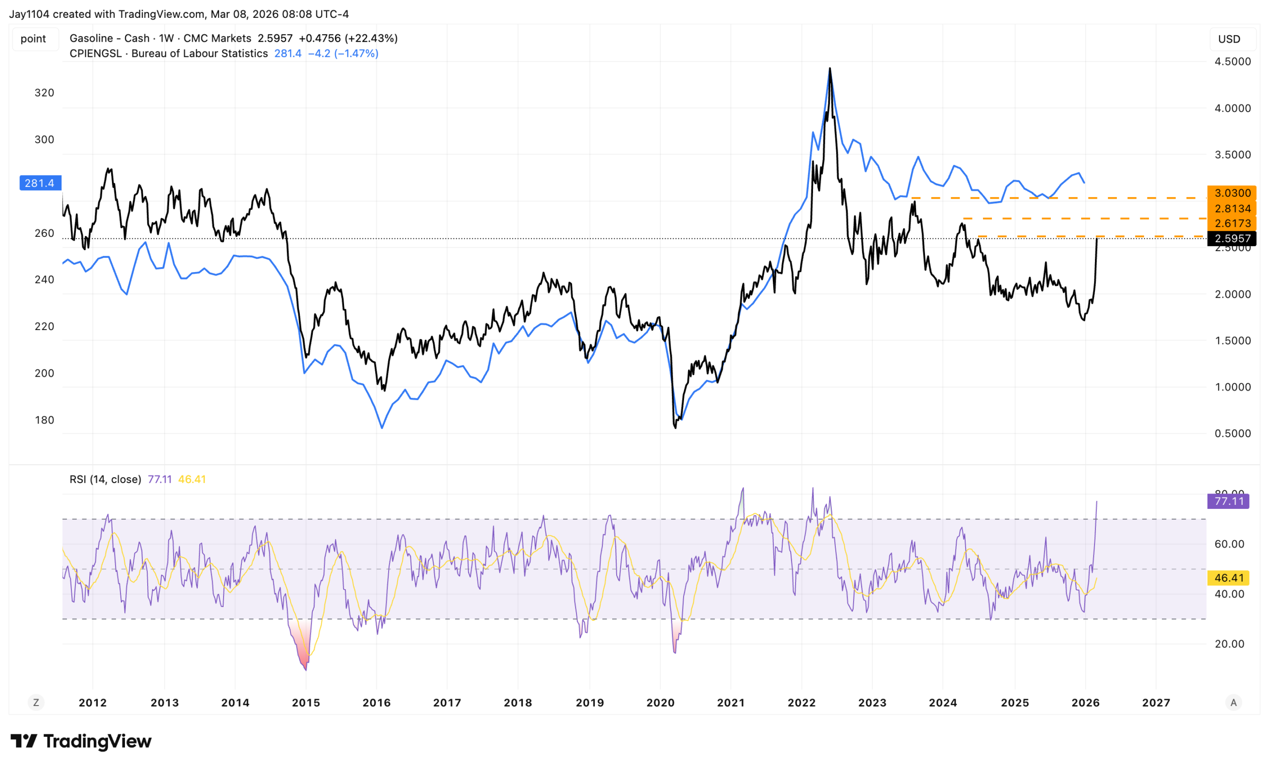 Of course, gasoline prices are also rising, and that becomes more significant given the current resistance at $2.60, followed by $2.81 and then $3.00. Rising gasoline and oil prices will not help the inflation outlook, and this week, inflation will be in focus, with both the February CPI and January PCE reports being released. For the most part, the CPI energy index simply follows the price of gasoline, so one can expect that while February energy data may not be affected much of the rise in oil and gasoline, March likely will. Gasoline alone has nearly a 3% weighting in the headline CPI report.