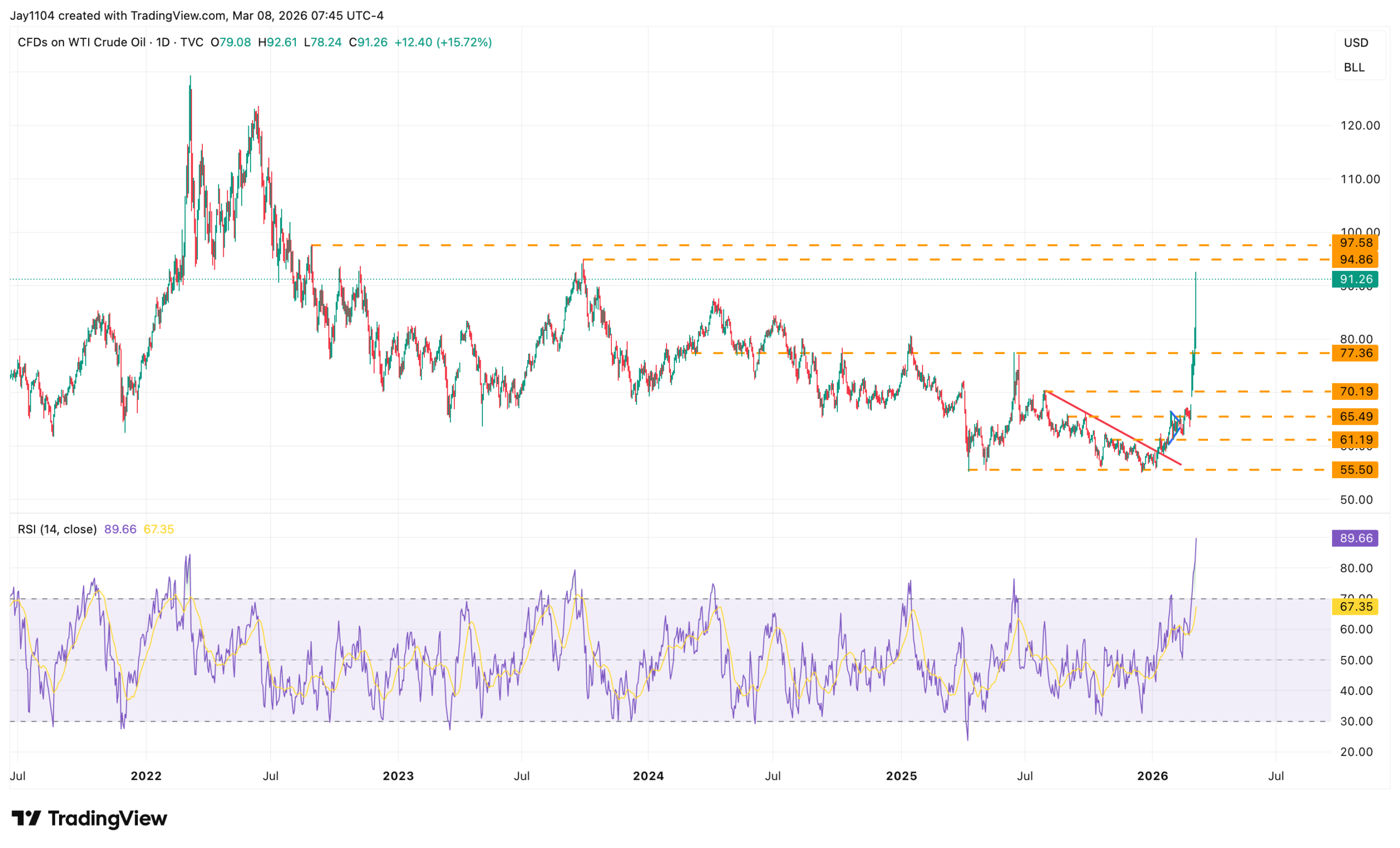 An open around $95 for oil would place it at its next level of resistance and its highest price since September 2023. After $95, things in oil get more interesting because resistance levels thin out, and we could easily see oil surge into the $100 to $110 range. Even though oil is technically overextended, with an RSI over 70 and trading well above its upper Bollinger Band, technicals currently take a back seat as the commodity reprices in our new world environment.