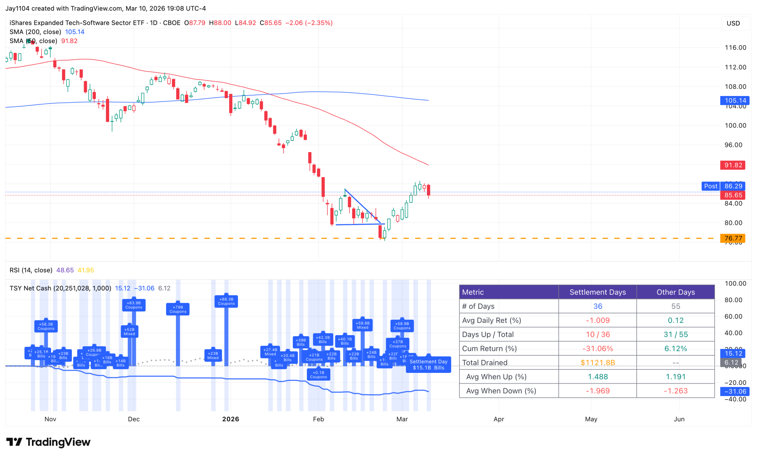 The software sector fell by more than 2% on the day, and apparently was the market’s preferred source of funds. The stats are pretty brutal. The IGV was rising on 10 out of 36 settlements with a cumulative decline of more than 30%.