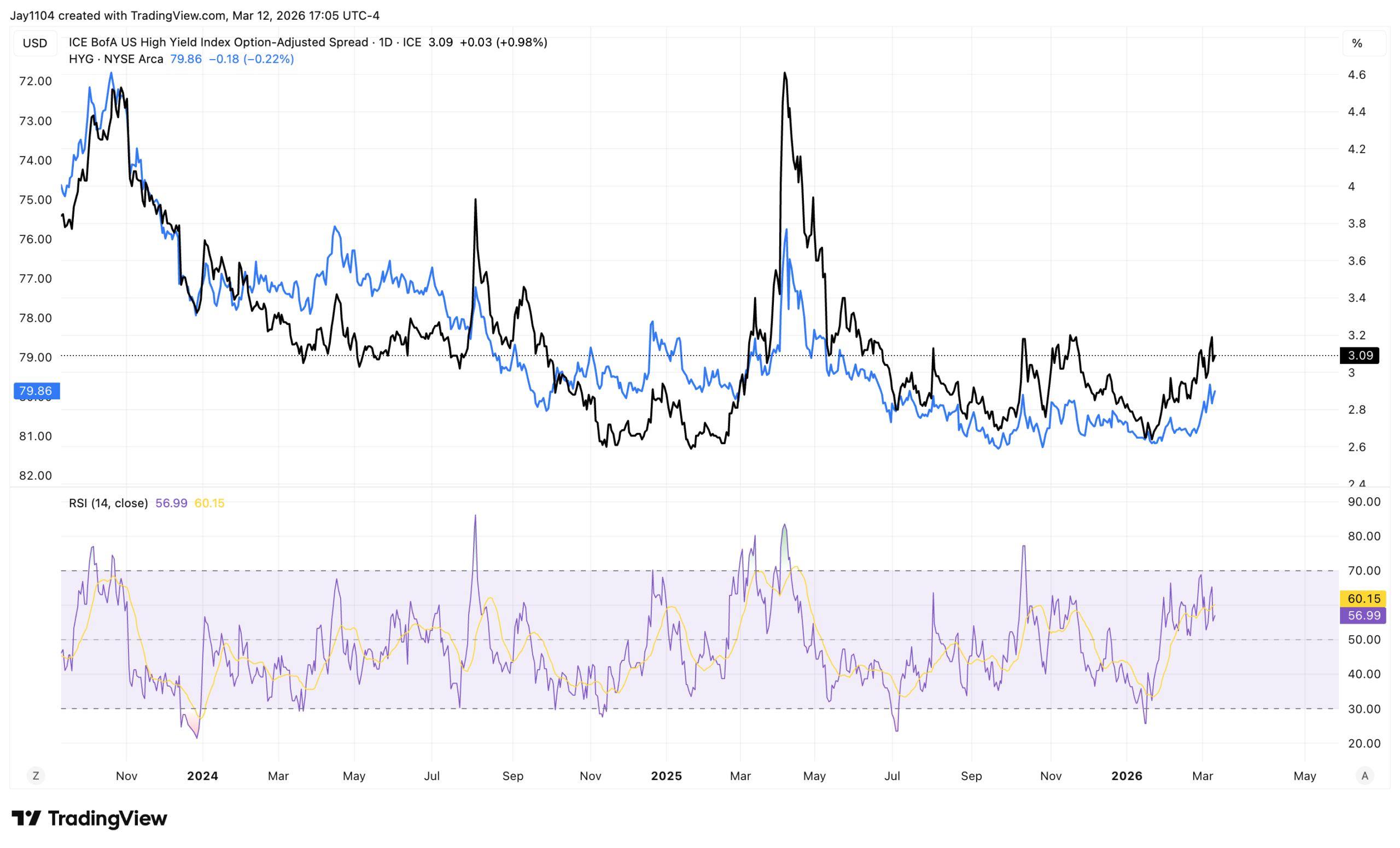 HYG ETF — The iShares iBoxx $ High Yield Corporate Bond ETF, commonly used as a liquid proxy for tracking movements in high-yield credit spreads.