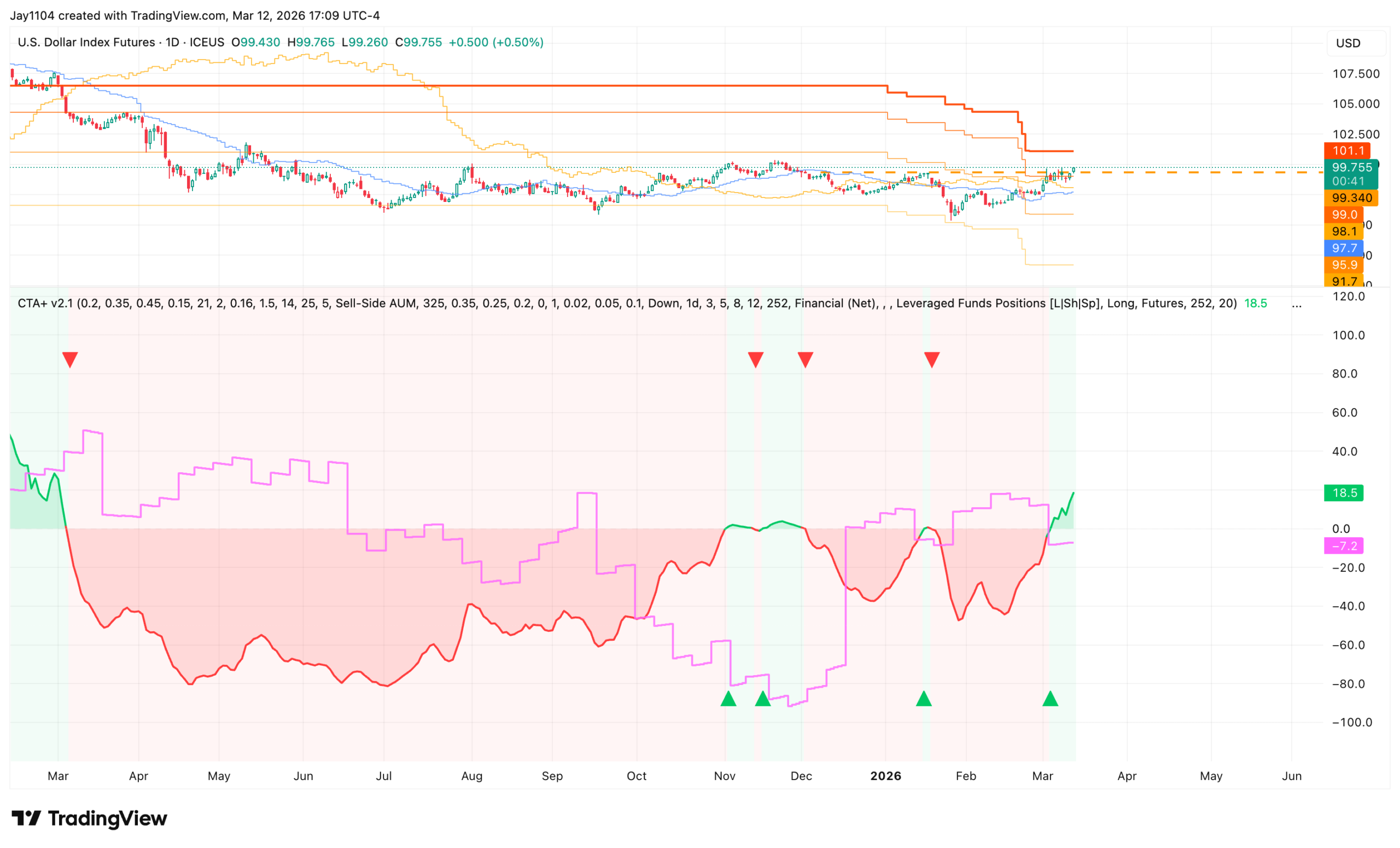 Meanwhile, today the dollar index futures rose above what appears to be resistance at 99.75, and it could very well be the case that systematic flows have already flipped from short to long, which may only add to the recent strength in the dollar. Certainly, just looking at the technical chart would suggest the dollar may have further to climb.