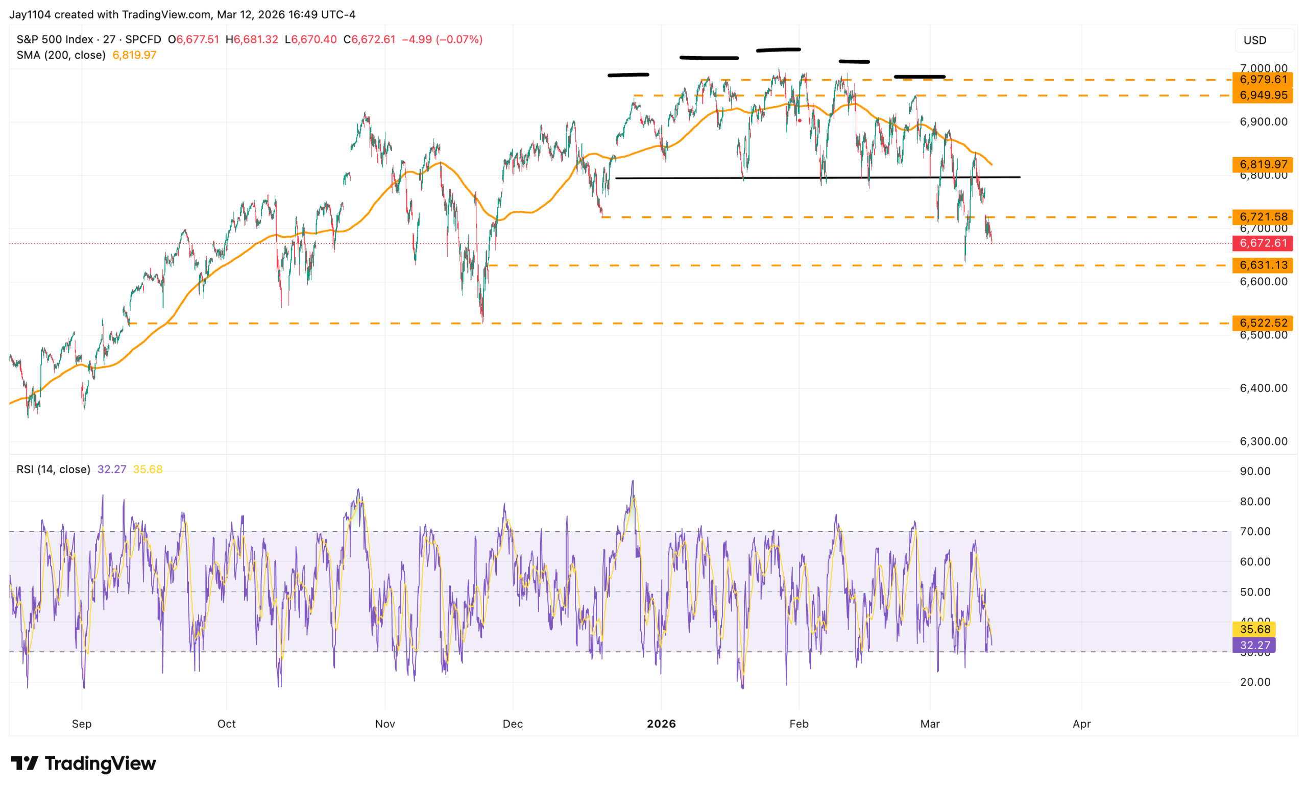 The S&P 500 fell by 1.5% today, marking its lowest close since mid-November. At this point, the index has broken support at 6,700, which sets up the next area of support around 6,600.