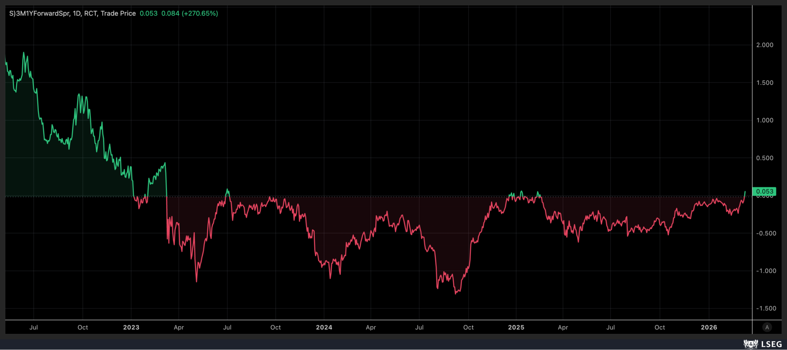 Finally, the 3-month Treasury yield 12 months forward closed 5 bps above the 3-month Treasury rate. That is the first time this has happened since last year, a further sign that rate cuts are quickly being taken out of the equation.