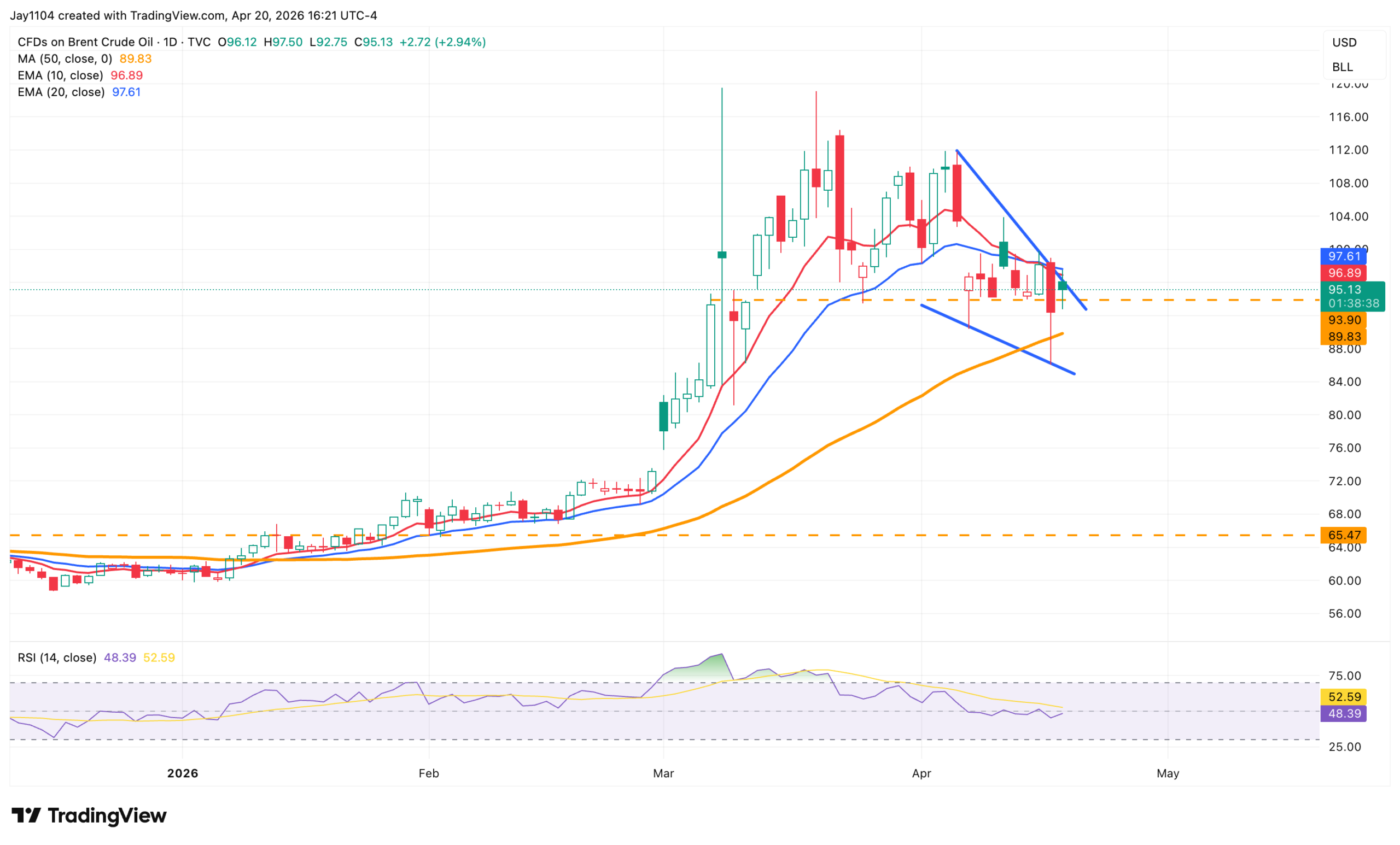 Brent crude moved back above $94, a level that continues to act as important support despite closing below it on Friday. From a technical perspective, the chart appears to be forming a falling wedge pattern. Price is supported by the 50-day moving average below, while resistance sits just above current levels at the 10- and 20-day exponential moving averages.