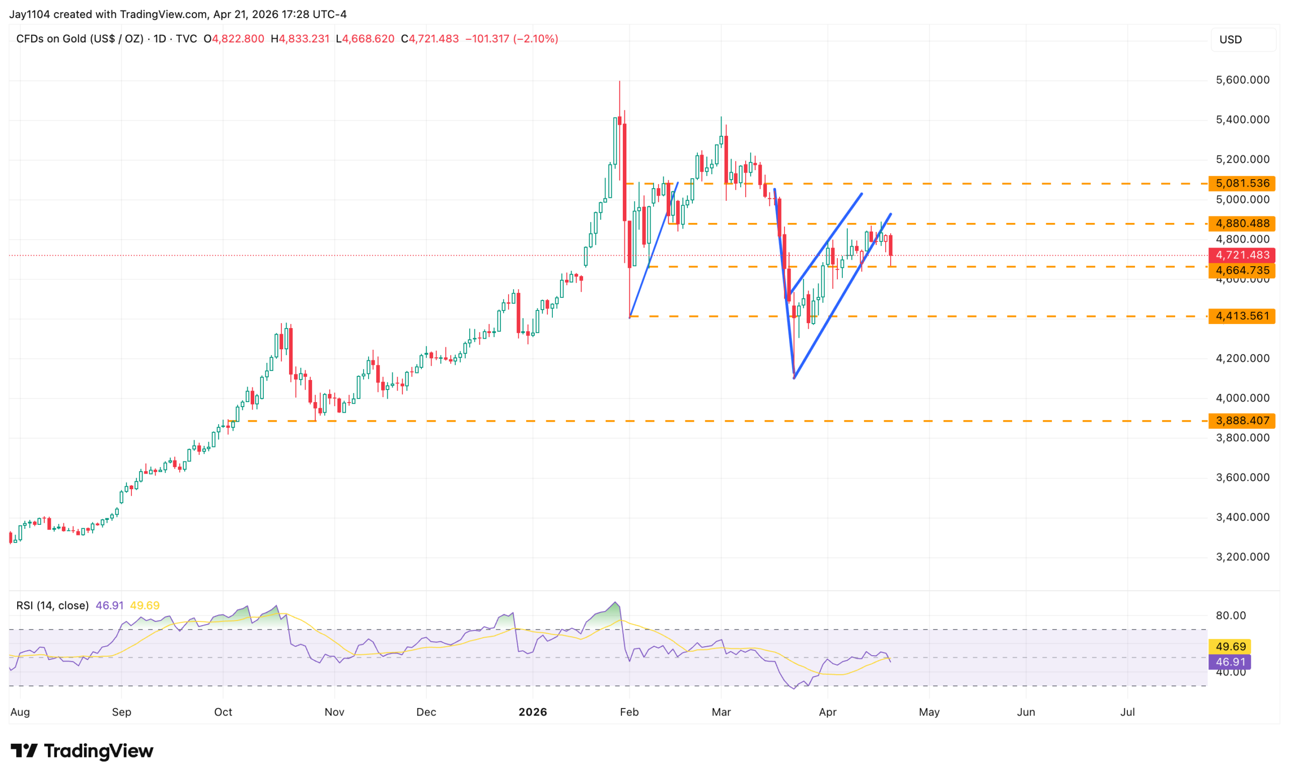 Meanwhile, gold is breaking down through its own bear flag today. The only question that remains is whether it falls through support at 4,670.
