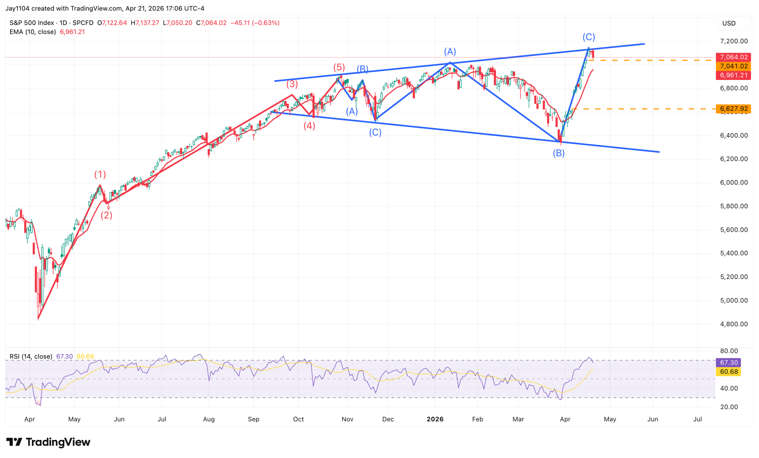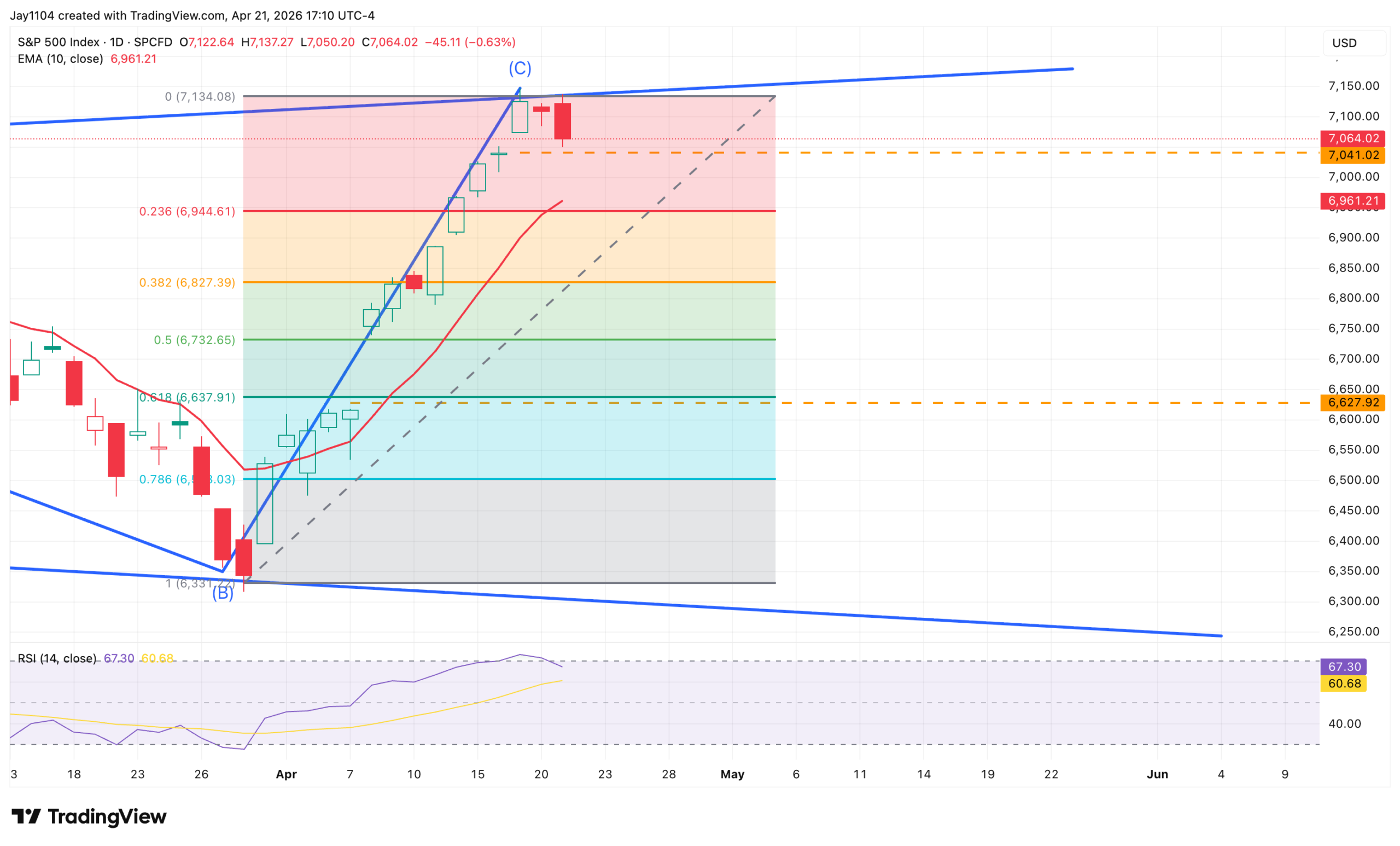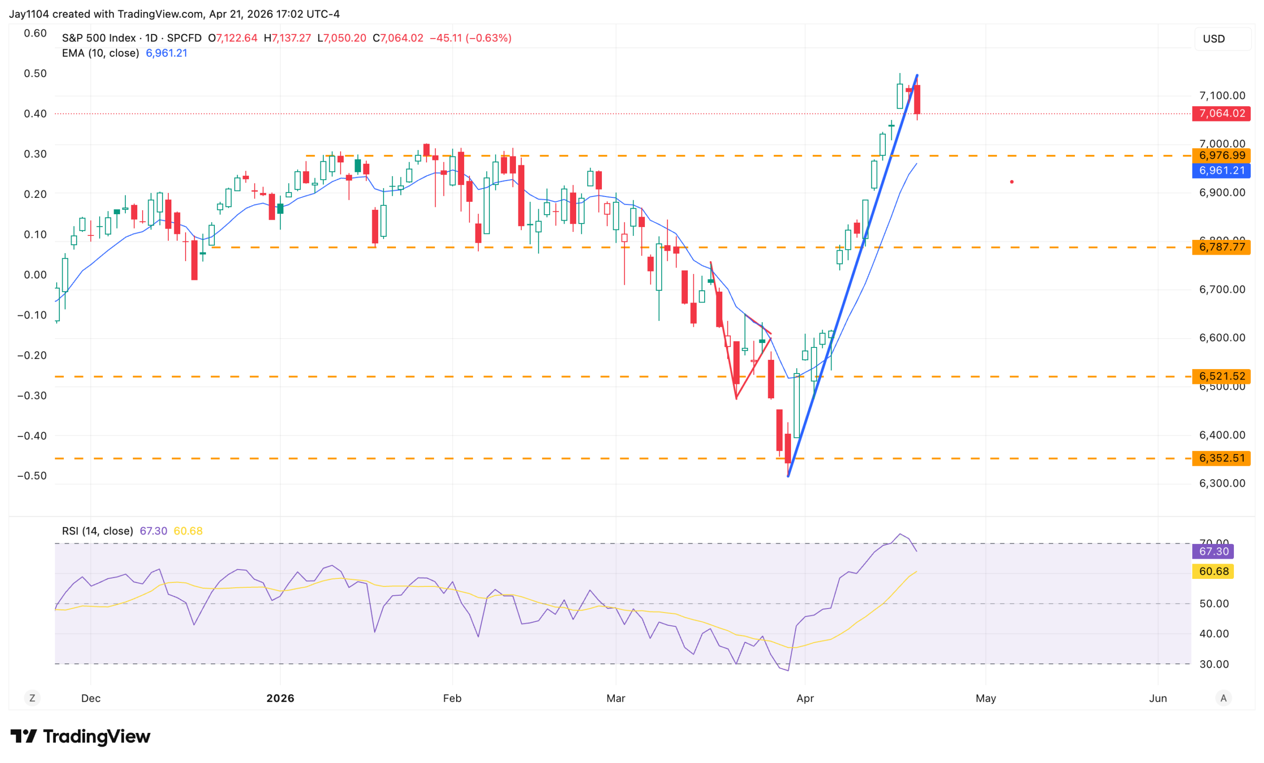 Subscribe →Stocks finished the day lower, with the S&P 500 breaking the uptrend that had formed off the late-March lows. The next level of support for the index comes around the 10-day exponential moving average, which roughly aligns with the support level of 6,975—a level that had previously acted as resistance.