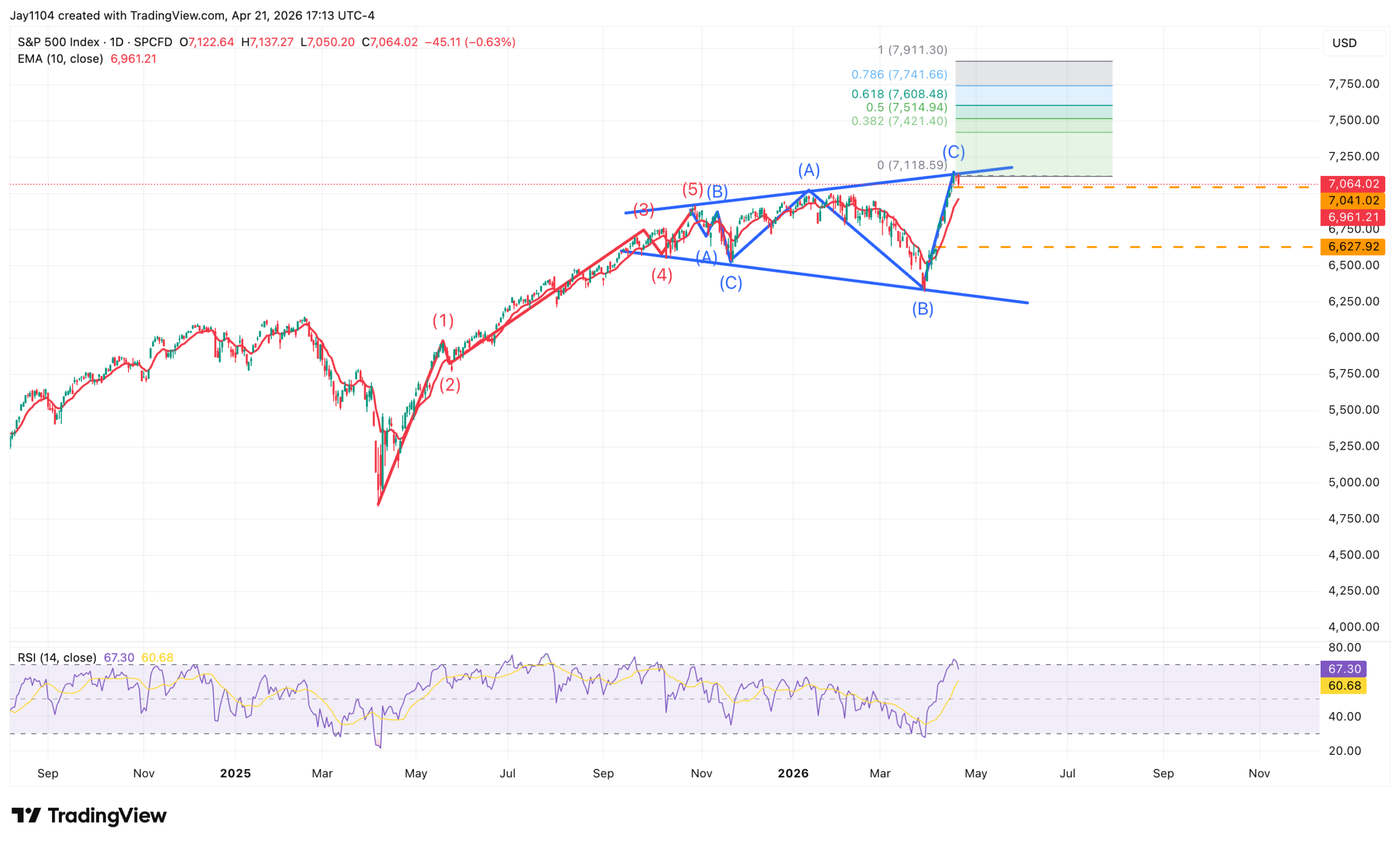 In the meantime, resistance at “C” in the megaphone pattern continues to hold. That’s notable, as a full resolution of the pattern would imply a move back to the lower boundary—potentially breaking below the recent March lows.