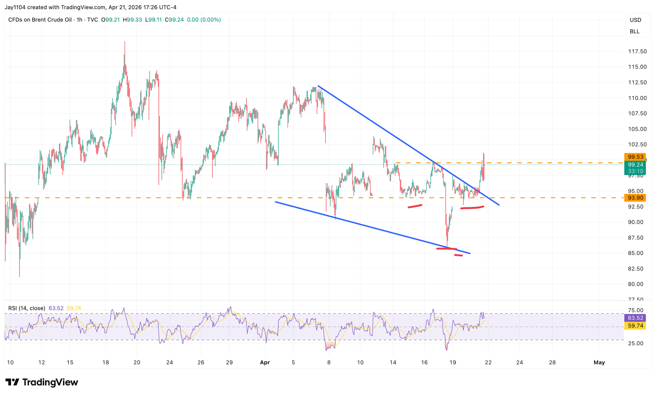Clearly, oil would be the bigger driver of higher rates. Setting aside the news and focusing on the technicals, the charts suggest that Brent crude could move higher from current levels, assuming the intraday inverted head-and-shoulders and the larger falling wedge patterns continue to play out.