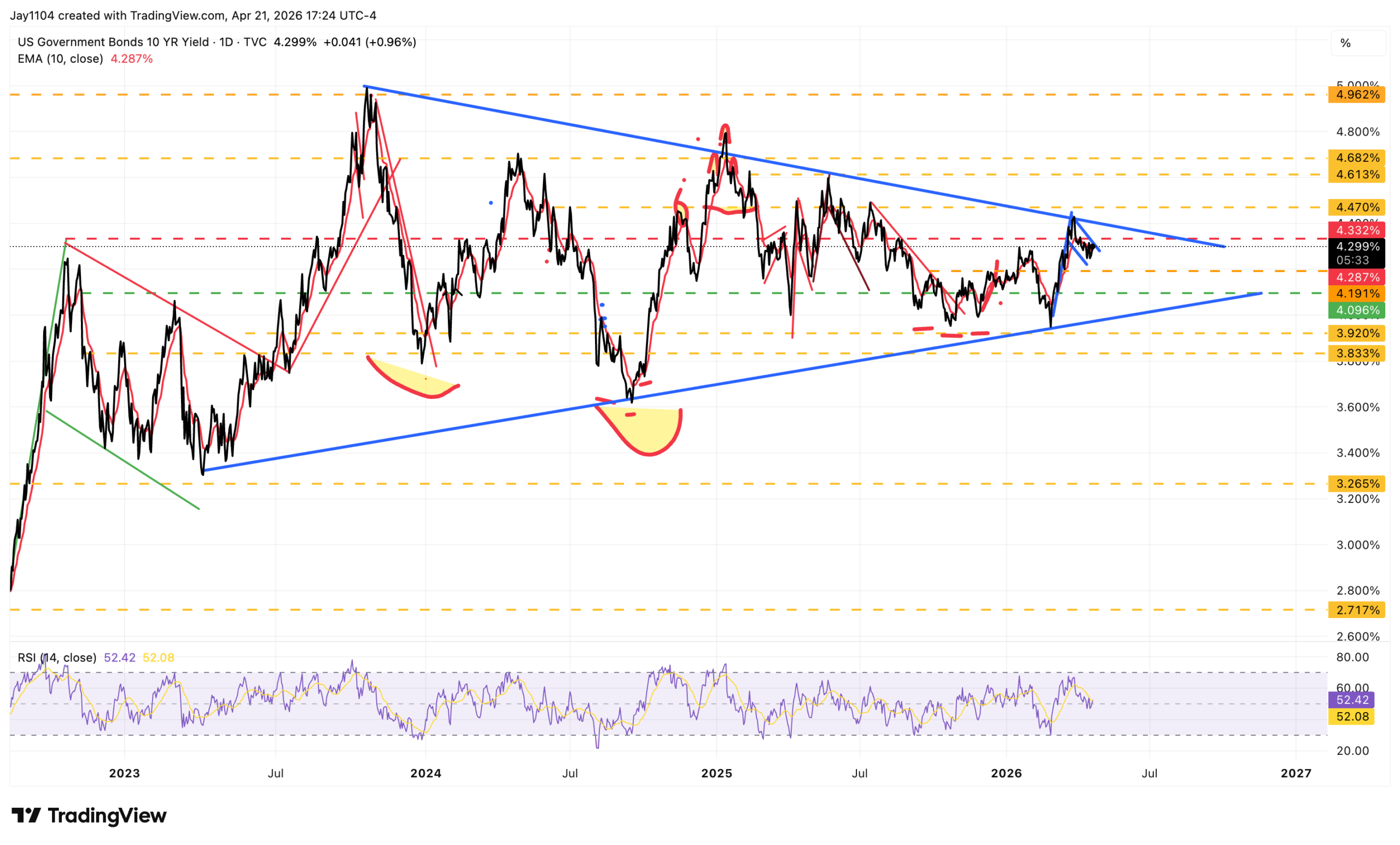 Rates did move higher on the day, likely driven more by oil than by Warsh. That said, rates are starting to take on a similar look to oil. The 10-year appears to be forming a bull flag, although resistance around 4.35% remains firm, and yields have not moved meaningfully in some time. The bigger concern comes just a few basis points higher, around 4.40%. A move through that level would likely mark a breakout from a multi-year consolidation phase and signal the start of a much larger move.