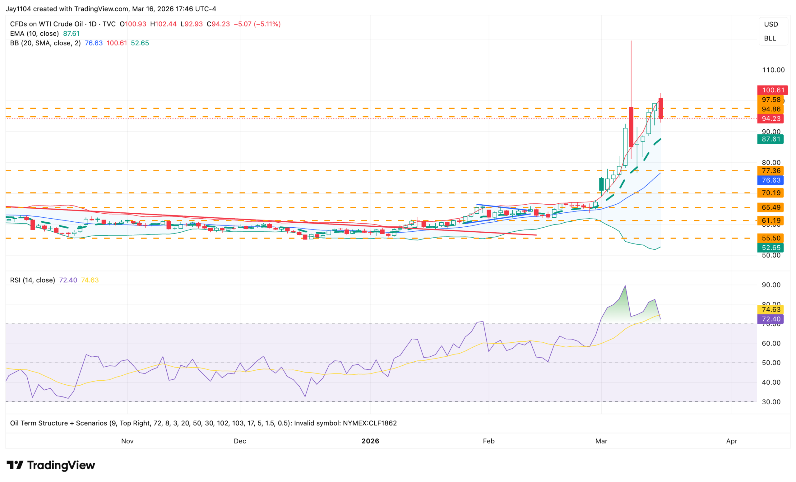 Oil fell by more than 5% on the day but remains stuck between the upper Bollinger Band and the 10-day exponential moving average. Nothing has really changed here. However, if oil continues to decline, it would be a significant positive for stocks and markets overall, as financial conditions would ease, rates would fall, and the dollar would weaken.