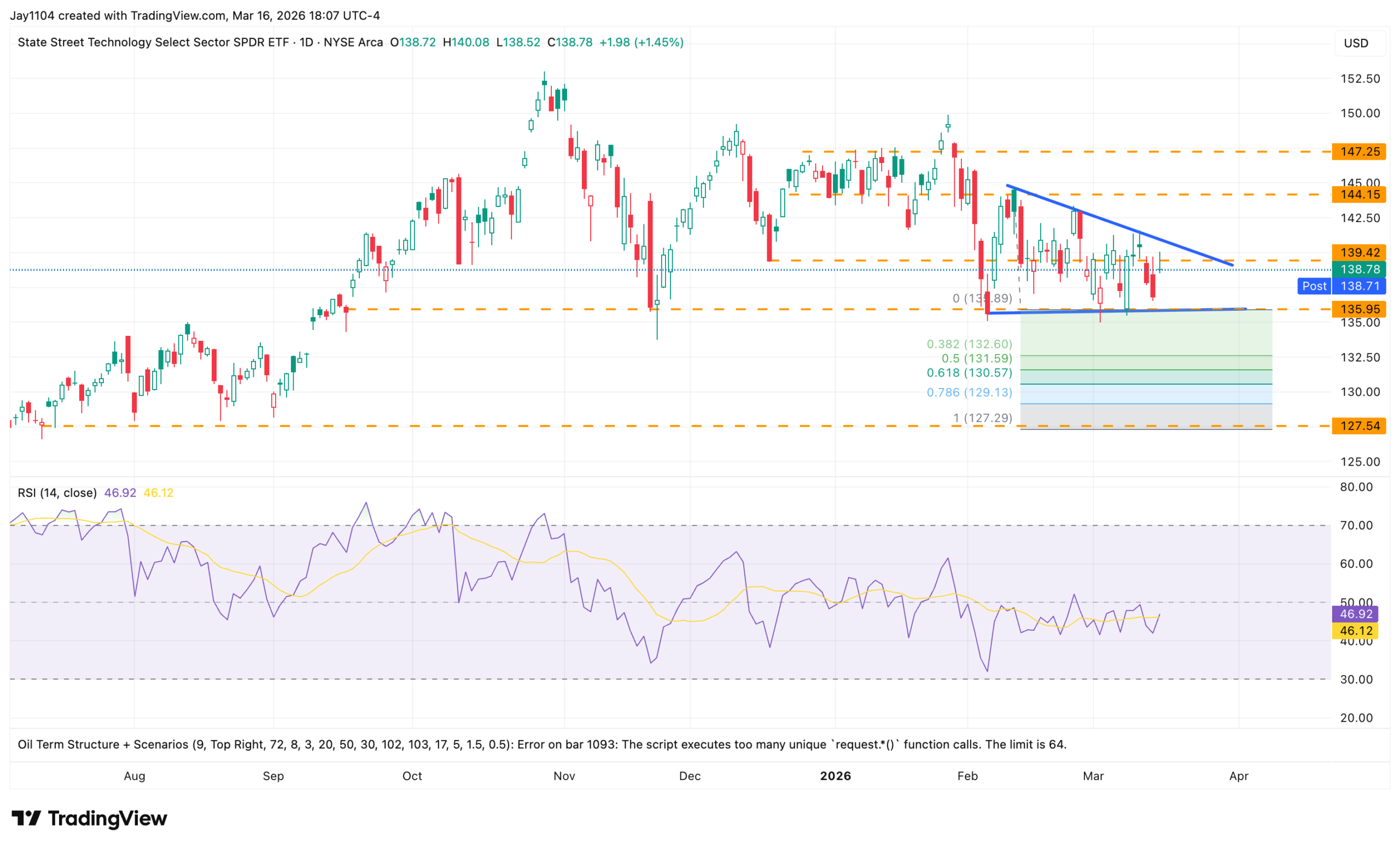 Finally, XLK is one to watch because it appears to be forming a descending triangle. A break below $138 could lead to a move down toward $127, based on a measured move from the peak of the triangle to the base. At this point, XLK would need to move above $141 to invalidate the pattern.
