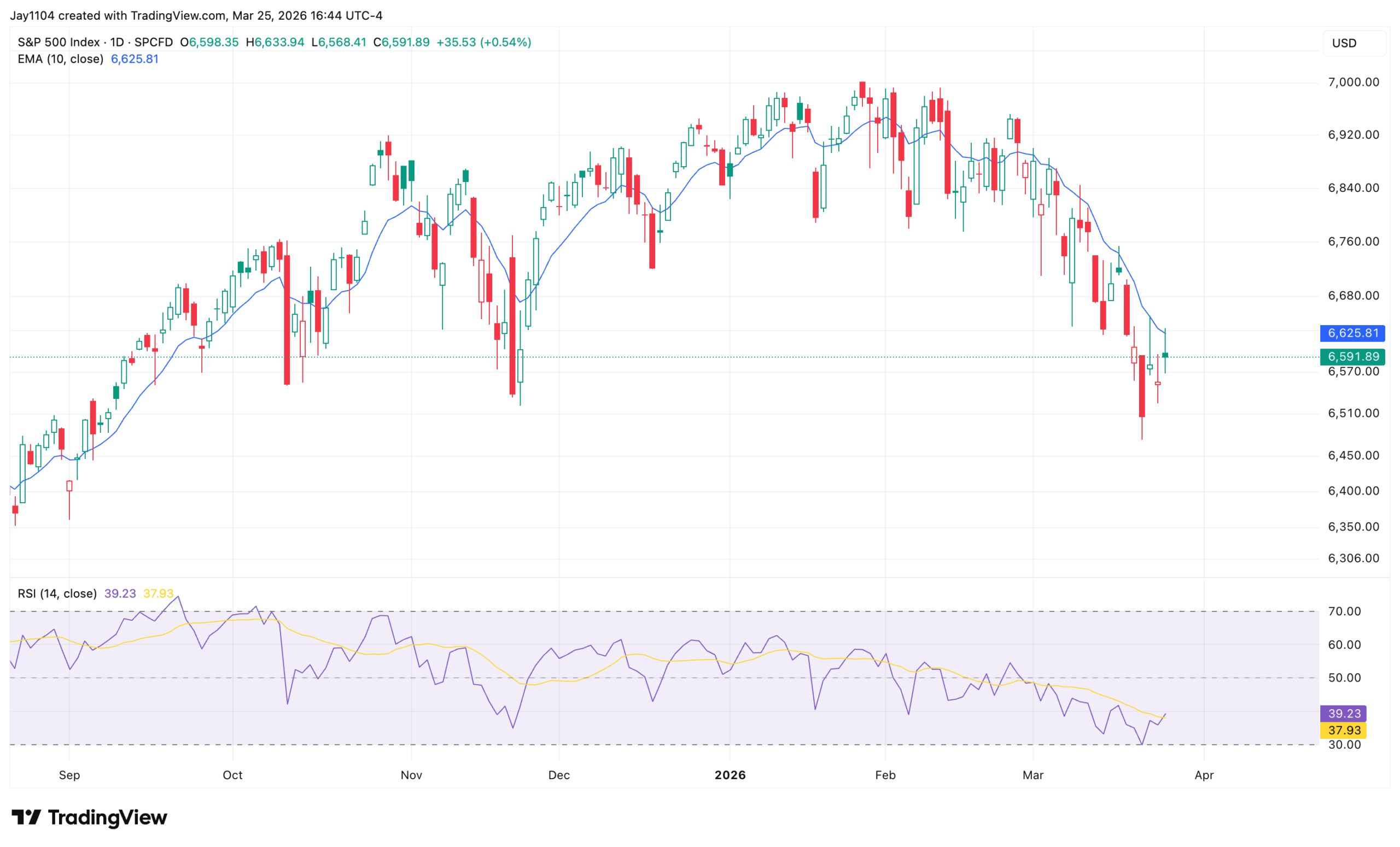 The moving averages continue to tell the story. The 10-day exponential moving average has been a ceiling that the index just can’t seem to punch through, and the 200-day moving average reinforces that resistance from above. Until the index can reclaim those levels, the path of least resistance remains lower.
