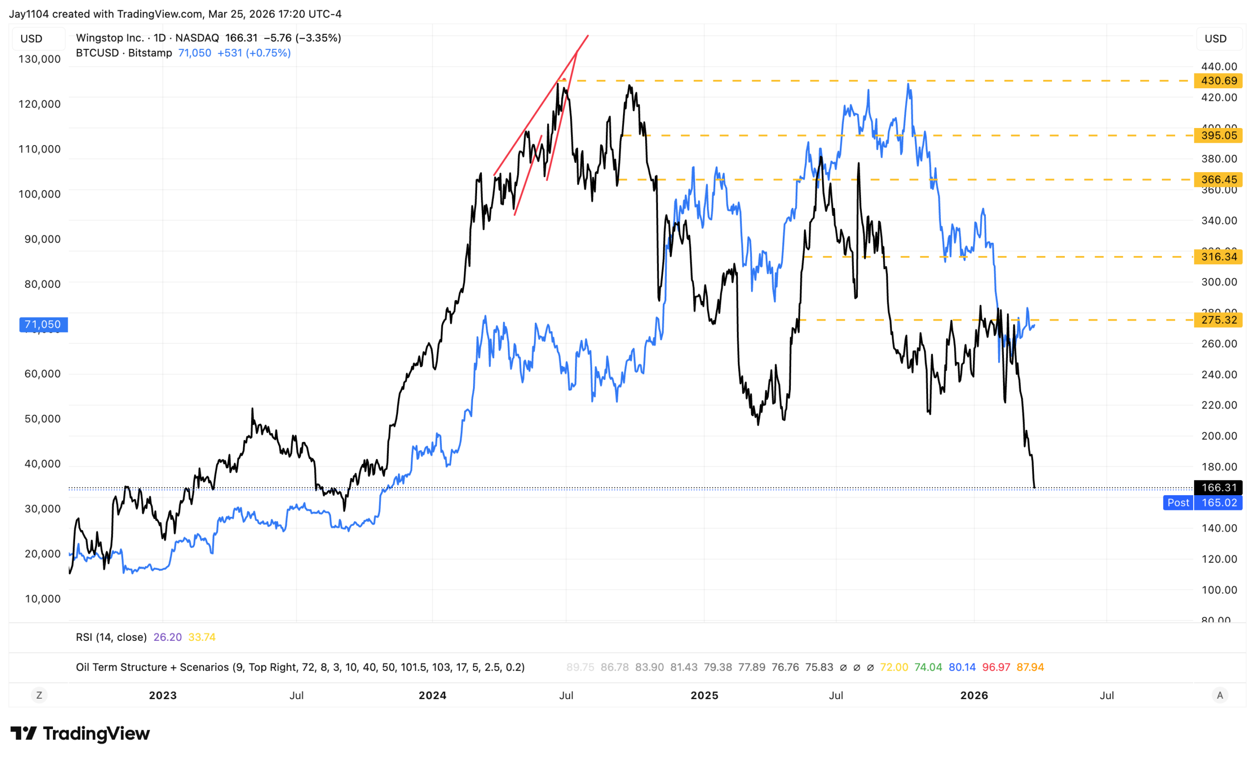 Speaking of Bitcoin, it appears to still be working through a bear flag pattern. Maybe it sees another push toward the upper end of the channel, who knows, but if the pattern holds, it’s unlikely to stay there for long. And Wingstop seems to agree.