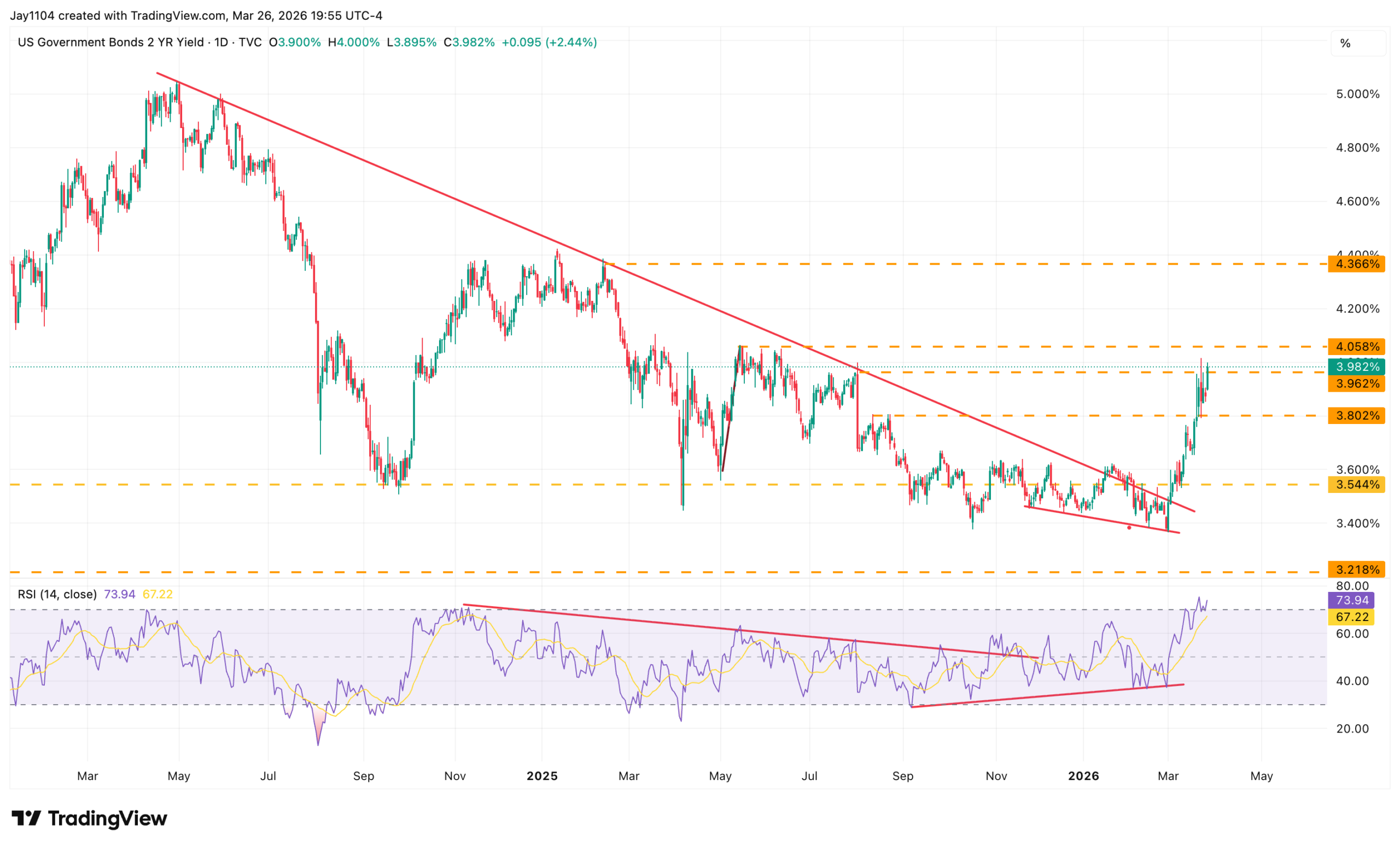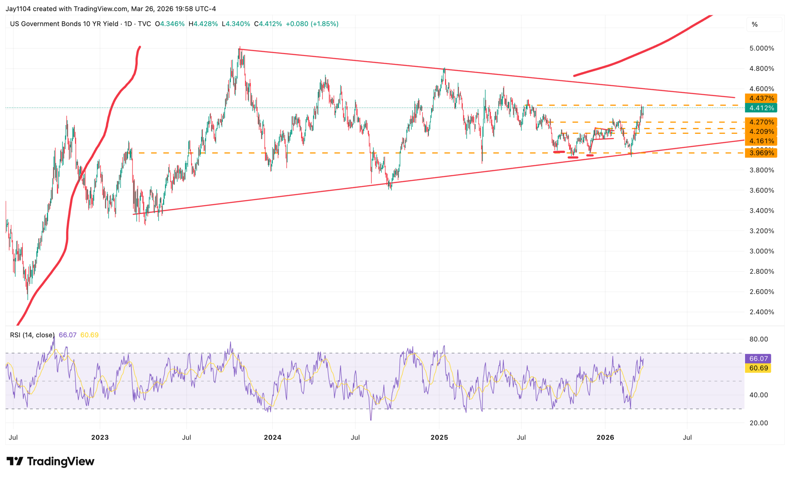 The 10-year rate is approaching a critical juncture as well. If it pushes through its current resistance zone around 4.4%, the path opens up toward levels that would bring it back to its long-term downtrend. That would be a significant development for risk assets across the board.